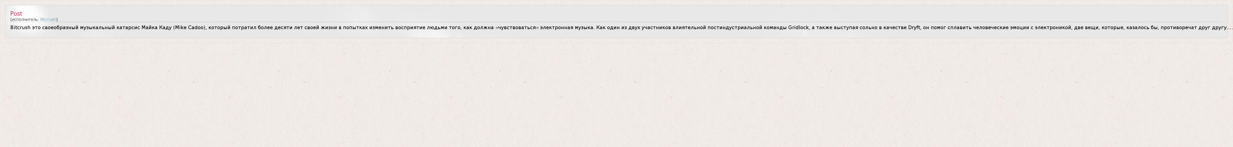 Bitcrush это своеобразный музыкальный катарсис Майка Каду (Mike Cadoo), который потратил более десяти лет своей жизни в попытках изменить восприятие людьми того, как должна «чувствоваться» электронная музыка. Как один из двух участников влиятельной постиндустриальной команды Gridlock, а также выступая сольно в качестве Dryft, он помог сплавить человеческие эмоции с электроникой, две вещи, которые, казалось бы, противоречат друг другу.…
