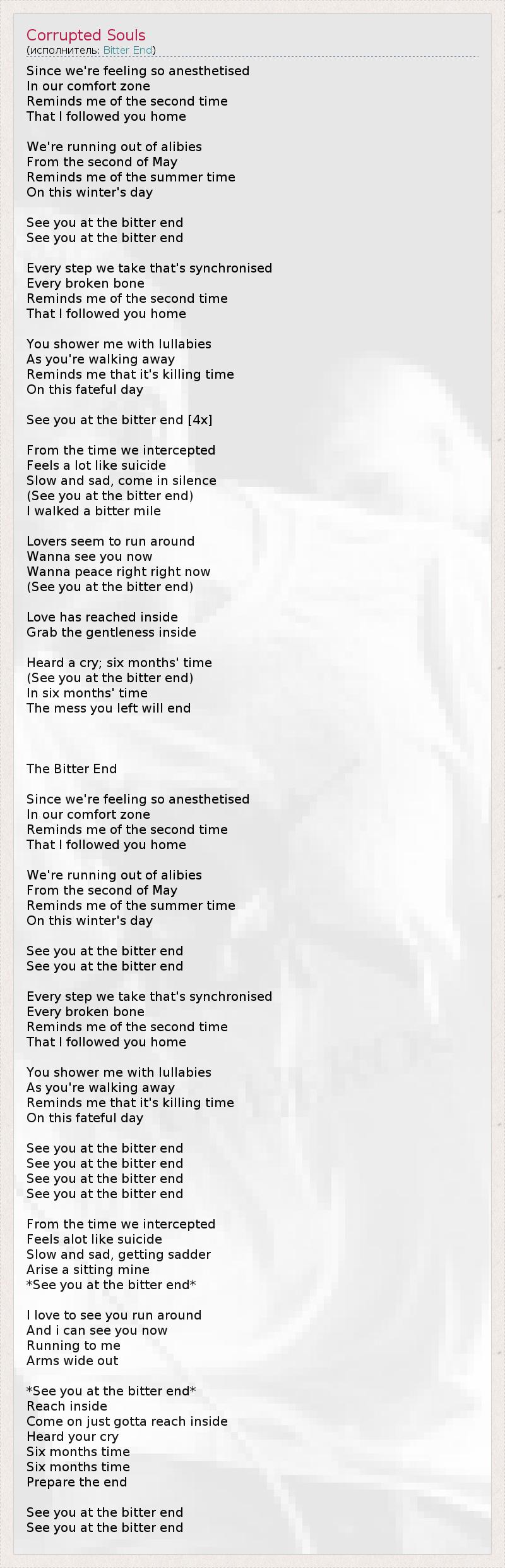 Since we're feeling so anesthetised In our comfort zone Reminds me of the second time That I followed you home We're running out of alibies From the second of May Reminds me of the summer time On this winter's day See you at the bitter end See you at the bitter end Every step we take that's synchronised Every broken bone Reminds me of the second time That I followed you home You shower me with lullabies As you're walking away Reminds me that it's killing time On this fateful day See you at the bitter end [4x] From the time we intercepted Feels a lot like suicide Slow and sad, come in silence (See you at the bitter end) I walked a bitter mile Lovers seem to run around Wanna see you now Wanna peace right right now (See you at the bitter end) Love has reached inside Grab the gentleness inside Heard a cry; six months' time (See you at the bitter end) In six months' time The mess you left will end The Bitter End Since we're feeling so anesthetised In our comfort zone Reminds me of the second time That I followed you home We're running out of alibies From the second of May Reminds me of the summer time On this winter's day See you at the bitter end See you at the bitter end Every step we take that's synchronised Every broken bone Reminds me of the second time That I followed you home You shower me with lullabies As you're walking away Reminds me that it's killing time On this fateful day See you at the bitter end See you at the bitter end See you at the bitter end See you at the bitter end From the time we intercepted Feels alot like suicide Slow and sad, getting sadder Arise a sitting mine *See you at the bitter end* I love to see you run around And i can see you now Running to me Arms wide out *See you at the bitter end* Reach inside Come on just gotta reach inside Heard your cry Six months time Six months time Prepare the end See you at the bitter end See you at the bitter end