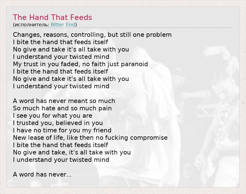 Изменения , причины, контролирующие , но все еще одна проблема Я кусать руку, которая кормит себя Нет давать и брать все это взять с Я понимаю ваше витой ум Мое доверие в вас не исчезла, нет веры просто параноик Я кусать руку, которая кормит себя Нет давать и брать все это взять с Я понимаю ваше витой ум Слово никогда не имел в виду так много Так много ненависти и так много боли Я вижу тебя за то, что вы Я доверял тебе , в тебя верил У меня нет времени для вас , мой друг Новую жизнь , как тогда не гребаный компромисса Я кусать руку, которая кормит себя Нет давать и брать , это не все взять с Я понимаю ваше витой ум Слово не имеет никогда ...