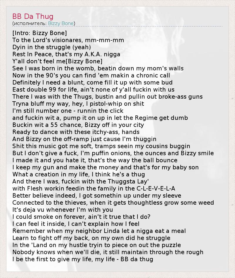 [Intro: Bizzy Bone] To the Lord's visionares, mm-mm-mm Dyin in the struggle (yeah) Rest In Peace, that's my A.K.A. nigga Y'all don't feel me[Bizzy Bone] See I was born in the womb, beatin down my mom's walls Now in the 90's you can find 'em makin a chronic call Definitely I need a blunt, come fill it up with some bud East double 99 for life, ain't none of y'all fuckin with us There I was with the Thugs, bustin and pullin out broke-ass guns Tryna bluff my way, hey, I pistol-whip on shit I'm still number one - runnin the click and fuckin wit a, pump it on up in let the Regime get dumb Buckin wit a 55 chance, Bizzy off in your city Ready to dance with these itchy-ass, hands And Bizzy on the off-ramp just cause I'm thuggin Shit this music got me soft, tramps seein my cousins buggin But I don't give a fuck, I'm puffin onions, the ounces and Bizzy smile I made it and you hate it, that's the way the ball bounce I keep my gun and make the money and that's for my baby son What a creation in my life, I think he's a thug And there I was, fuckin with the Thuggsta Lay' with Flesh workin feedin the family in the C-L-E-V-E-L-A Better believe indeed, I got somethin up under my sleeve Connected to the thieves, when it gets thoughtless grow some weed It's deja vu whenever I'm with you I could smoke on forever, ain't it true that I do? I can feel it inside, I can't explain how I feel Remember when my neighbor Linda let a nigga eat a meal Learn to fight off my back, on my own did he struggle In the 'Land on my hustle tryin to piece on out the puzzle Nobody knows when we'll die, it still maintain through the rough I be the first to give my life, my life - BB da thug