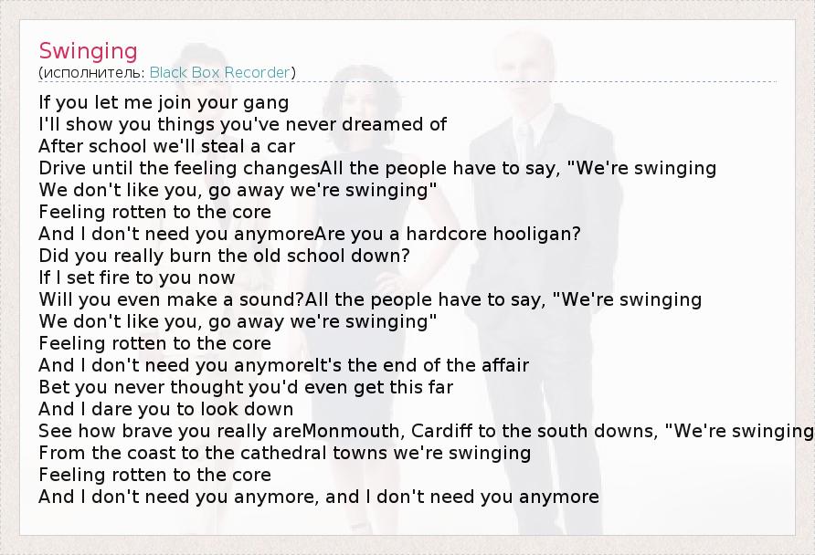 If you let me join your gang I'll show you things you've never dreamed of After school we'll steal a car Drive until the feeling changesAll the people have to say, "We're swinging We don't like you, go away we're swinging" Feeling rotten to the core And I don't need you anymoreAre you a hardcore hooligan? Did you really burn the old school down? If I set fire to you now Will you even make a sound?All the people have to say, "We're swinging We don't like you, go away we're swinging" Feeling rotten to the core And I don't need you anymoreIt's the end of the affair Bet you never thought you'd even get this far And I dare you to look down See how brave you really areMonmouth, Cardiff to the south downs, "We're swinging From the coast to the cathedral towns we're swinging Feeling rotten to the core And I don't need you anymore, and I don't need you anymore