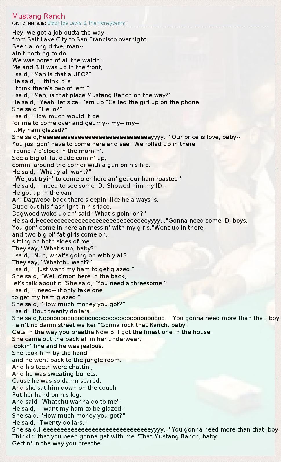 Hey, we got a job outta the way-- from Salt Lake City to San Francisco overnight. Been a long drive, man-- ain't nothing to do. We was bored of all the waitin'. Me and Bill was up in the front, I said, "Man is that a UFO?" He said, "I think it is. I think there's two of 'em." I said, "Man, is that place Mustang Ranch on the way?" He said, "Yeah, let's call 'em up."Called the girl up on the phone She said "Hello?" I said, "How much would it be for me to come over and get my-- my-- my-- ...My ham glazed?" She said,Heeeeeeeeeeeeeeeeeeeeeeeeeeeeeeeyyyy..."Our price is love, baby-- You jus' gon' have to come here and see."We rolled up in there 'round 7 o'clock in the mornin'. See a big ol' fat dude comin' up, comin' around the corner with a gun on his hip. He said, "What y'all want?" "We just tryin' to come o'er here an' get our ham roasted." He said, "I need to see some ID."Showed him my ID-- He got up in the van. An' Dagwood back there sleepin' like he always is. Dude put his flashlight in his face, Dagwood woke up an' said "What's goin' on?" He said,Heeeeeeeeeeeeeeeeeeeeeeeeeeeeeeeyyyy..."Gonna need some ID, boys. You gon' come in here an messin' with my girls."Went up in there, and two big ol' fat girls come on, sitting on both sides of me. They say, "What's up, baby?" I said, "Nuh, what's going on with y'all?" They say, "Whatchu want?" I said, "I just want my ham to get glazed." She said, "Well c'mon here in the back, let's talk about it."She said, "You need a threesome." I said, "I need-- it only take one to get my ham glazed." She said, "How much money you got?" I said ''Bout twenty dollars." She said,Nooooooooooooooooooooooooooooooooooo..."You gonna need more than that, boy. I ain't no damn street walker."Gonna rock that Ranch, baby. Gets in the way you breathe.Now Bill got the finest one in the house. She came out the back all in her underwear, lookin' fine and he was jealous. She took him by the hand, and he went back to the jungle room. And his teeth were chattin', And he was sweating bullets, Cause he was so damn scared. And she sat him down on the couch Put her hand on his leg. And said "Whatchu wanna do to me" He said, "I want my ham to be glazed." She said, "How much money you got?" He said, "Twenty dollars." She said,Heeeeeeeeeeeeeeeeeeeeeeeeeeeeeeeyyyy..."You gonna need more than that, boy. Thinkin' that you been gonna get with me."That Mustang Ranch, baby. Gettin' in the way you breathe.