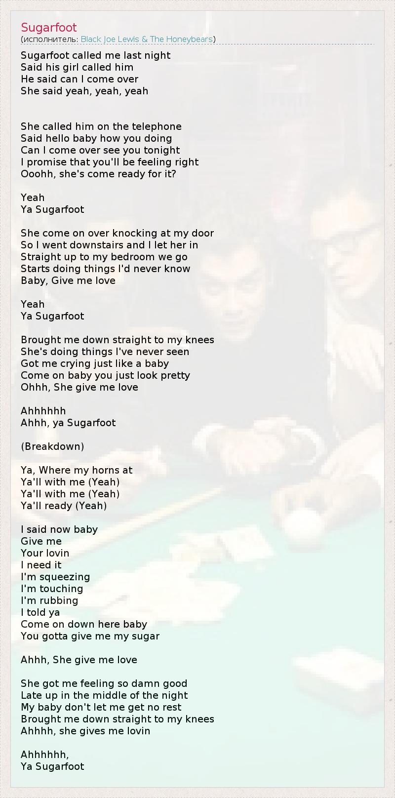 Sugarfoot called me last night Said his girl called him He said can I come over She said yeah, yeah, yeah She called him on the telephone Said hello baby how you doing Can I come over see you tonight I promise that you'll be feeling right Ooohh, she's come ready for it? Yeah Ya Sugarfoot She come on over knocking at my door So I went downstairs and I let her in Straight up to my bedroom we go Starts doing things I'd never know Baby, Give me love Yeah Ya Sugarfoot Brought me down straight to my knees She's doing things I've never seen Got me crying just like a baby Come on baby you just look pretty Ohhh, She give me love Ahhhhhh Ahhh, ya Sugarfoot (Breakdown) Ya, Where my horns at Ya'll with me (Yeah) Ya'll with me (Yeah) Ya'll ready (Yeah) I said now baby Give me Your lovin I need it I'm squeezing I'm touching I'm rubbing I told ya Come on down here baby You gotta give me my sugar Ahhh, She give me love She got me feeling so damn good Late up in the middle of the night My baby don't let me get no rest Brought me down straight to my knees Ahhhh, she gives me lovin Ahhhhhh, Ya Sugarfoot