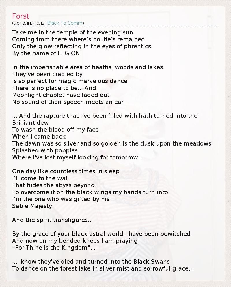 Take me in the temple of the evening sun Coming from there where's no life's remained Only the glow reflecting in the eyes of phrentics By the name of LEGION In the imperishable area of heaths, woods and lakes They've been cradled by Is so perfect for magic marvelous dance There is no place to be... And Moonlight chaplet have faded out No sound of their speech meets an ear ... And the rapture that I've been filled with hath turned into the Brilliant dew To wash the blood off my face When I came back The dawn was so silver and so golden is the dusk upon the meadows Splashed with poppies Where I've lost myself looking for tomorrow... One day like countless times in sleep I'll come to the wall That hides the abyss beyond... To overcome it on the black wings my hands turn into I'm the one who was gifted by his Sable Majesty And the spirit transfigures... By the grace of your black astral world I have been bewitched And now on my bended knees I am praying "For Thine is the Kingdom"... ...I know they've died and turned into the Black Swans To dance on the forest lake in silver mist and sorrowful grace...