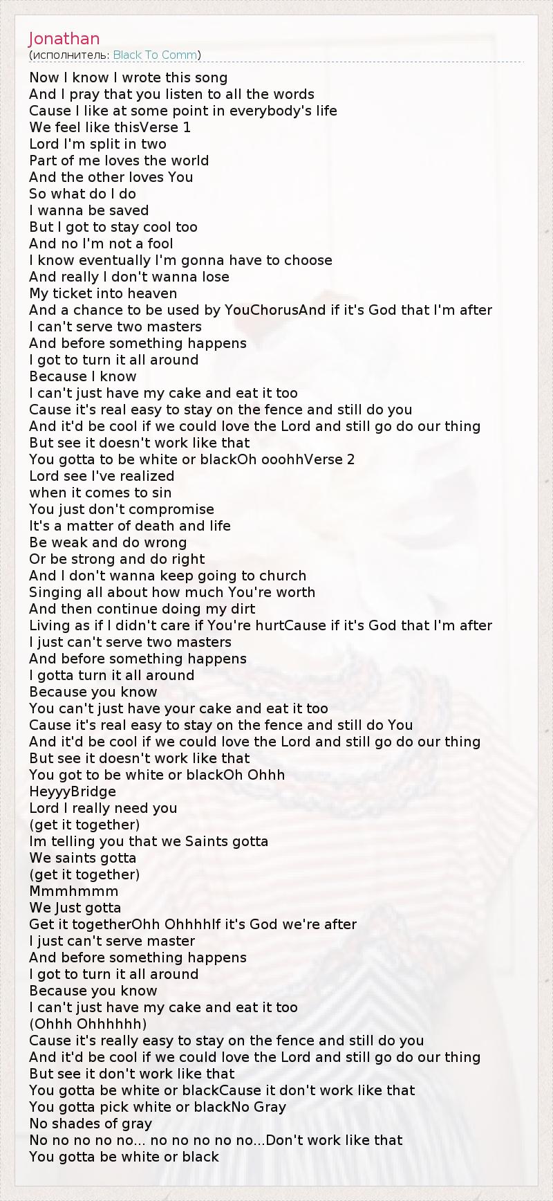 Now I know I wrote this song And I pray that you listen to all the words Cause I like at some point in everybody's life We feel like thisVerse 1 Lord I'm split in two Part of me loves the world And the other loves You So what do I do I wanna be saved But I got to stay cool too And no I'm not a fool I know eventually I'm gonna have to choose And really I don't wanna lose My ticket into heaven And a chance to be used by YouChorusAnd if it's God that I'm after I can't serve two masters And before something happens I got to turn it all around Because I know I can't just have my cake and eat it too Cause it's real easy to stay on the fence and still do you And it'd be cool if we could love the Lord and still go do our thing But see it doesn't work like that You gotta to be white or blackOh ooohhVerse 2 Lord see I've realized when it comes to sin You just don't compromise It's a matter of death and life Be weak and do wrong Or be strong and do right And I don't wanna keep going to church Singing all about how much You're worth And then continue doing my dirt Living as if I didn't care if You're hurtCause if it's God that I'm after I just can't serve two masters And before something happens I gotta turn it all around Because you know You can't just have your cake and eat it too Cause it's real easy to stay on the fence and still do You And it'd be cool if we could love the Lord and still go do our thing But see it doesn't work like that You got to be white or blackOh Ohhh HeyyyBridge Lord I really need you (get it together) Im telling you that we Saints gotta We saints gotta (get it together) Mmmhmmm We Just gotta Get it togetherOhh OhhhhIf it's God we're after I just can't serve master And before something happens I got to turn it all around Because you know I can't just have my cake and eat it too (Ohhh Ohhhhhh) Cause it's really easy to stay on the fence and still do you And it'd be cool if we could love the Lord and still go do our thing But see it don't work like that You gotta be white or blackCause it don't work like that You gotta pick white or blackNo Gray No shades of gray No no no no no... no no no no no...Don't work like that You gotta be white or black