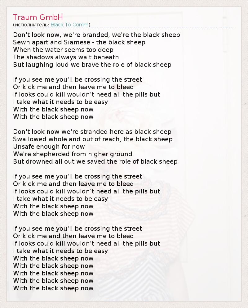 Don't look now, we're branded, we're the black sheep Sewn apart and Siamese - the black sheep When the water seems too deep The shadows always wait beneath But laughing loud we brave the role of black sheep If you see me you'll be crossing the street Or kick me and then leave me to bleed If looks could kill wouldn't need all the pills but I take what it needs to be easy With the black sheep now With the black sheep now Don't look now we're stranded here as black sheep Swallowed whole and out of reach, the black sheep Unsafe enough for now We're shepherded from higher ground But drowned all out we saved the role of black sheep If you see me you'll be crossing the street Or kick me and then leave me to bleed If looks could kill wouldn't need all the pills but I take what it needs to be easy With the black sheep now With the black sheep now If you see me you'll be crossing the street Or kick me and then leave me to bleed If looks could kill wouldn't need all the pills but I take what it needs to be easy With the black sheep now With the black sheep now With the black sheep now With the black sheep now With the black sheep now