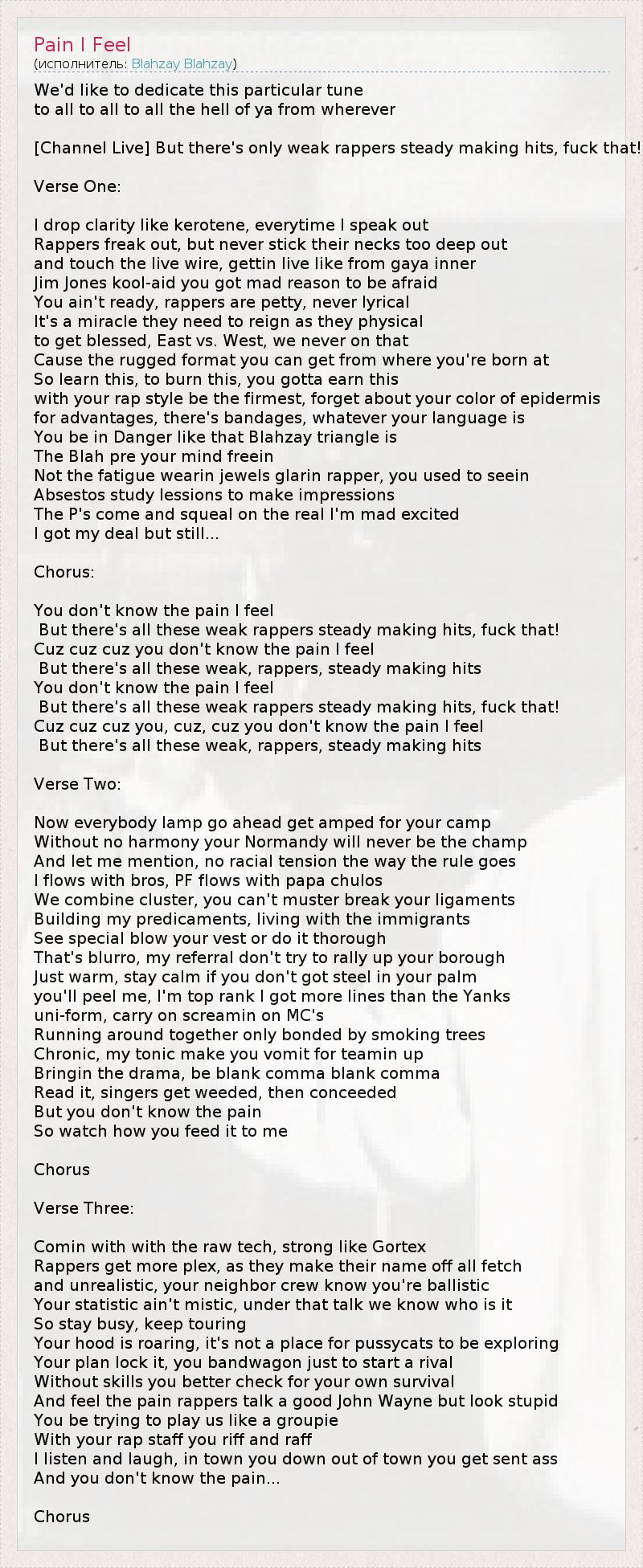 We'd like to dedicate this particular tune to all to all to all the hell of ya from wherever [Channel Live] But there's only weak rappers steady making hits, fuck that! Verse One: I drop clarity like kerotene, everytime I speak out Rappers freak out, but never stick their necks too deep out and touch the live wire, gettin live like from gaya inner Jim Jones kool-aid you got mad reason to be afraid You ain't ready, rappers are petty, never lyrical It's a miracle they need to reign as they physical to get blessed, East vs. West, we never on that Cause the rugged format you can get from where you're born at So learn this, to burn this, you gotta earn this with your rap style be the firmest, forget about your color of epidermis for advantages, there's bandages, whatever your language is You be in Danger like that Blahzay triangle is The Blah pre your mind freein Not the fatigue wearin jewels glarin rapper, you used to seein Absestos study lessions to make impressions The P's come and squeal on the real I'm mad excited I got my deal but still... Chorus: You don't know the pain I feel But there's all these weak rappers steady making hits, fuck that! Cuz cuz cuz you don't know the pain I feel But there's all these weak, rappers, steady making hits You don't know the pain I feel But there's all these weak rappers steady making hits, fuck that! Cuz cuz cuz you, cuz, cuz you don't know the pain I feel But there's all these weak, rappers, steady making hits Verse Two: Now everybody lamp go ahead get amped for your camp Without no harmony your Normandy will never be the champ And let me mention, no racial tension the way the rule goes I flows with bros, PF flows with papa chulos We combine cluster, you can't muster break your ligaments Building my predicaments, living with the immigrants See special blow your vest or do it thorough That's blurro, my referral don't try to rally up your borough Just warm, stay calm if you don't got steel in your palm you'll peel me, I'm top rank I got more lines than the Yanks uni-form, carry on screamin on MC's Running around together only bonded by smoking trees Chronic, my tonic make you vomit for teamin up Bringin the drama, be blank comma blank comma Read it, singers get weeded, then conceeded But you don't know the pain So watch how you feed it to me Chorus Verse Three: Comin with with the raw tech, strong like Gortex Rappers get more plex, as they make their name off all fetch and unrealistic, your neighbor crew know you're ballistic Your statistic ain't mistic, under that talk we know who is it So stay busy, keep touring Your hood is roaring, it's not a place for pussycats to be exploring Your plan lock it, you bandwagon just to start a rival Without skills you better check for your own survival And feel the pain rappers talk a good John Wayne but look stupid You be trying to play us like a groupie With your rap staff you riff and raff I listen and laugh, in town you down out of town you get sent ass And you don't know the pain... Chorus