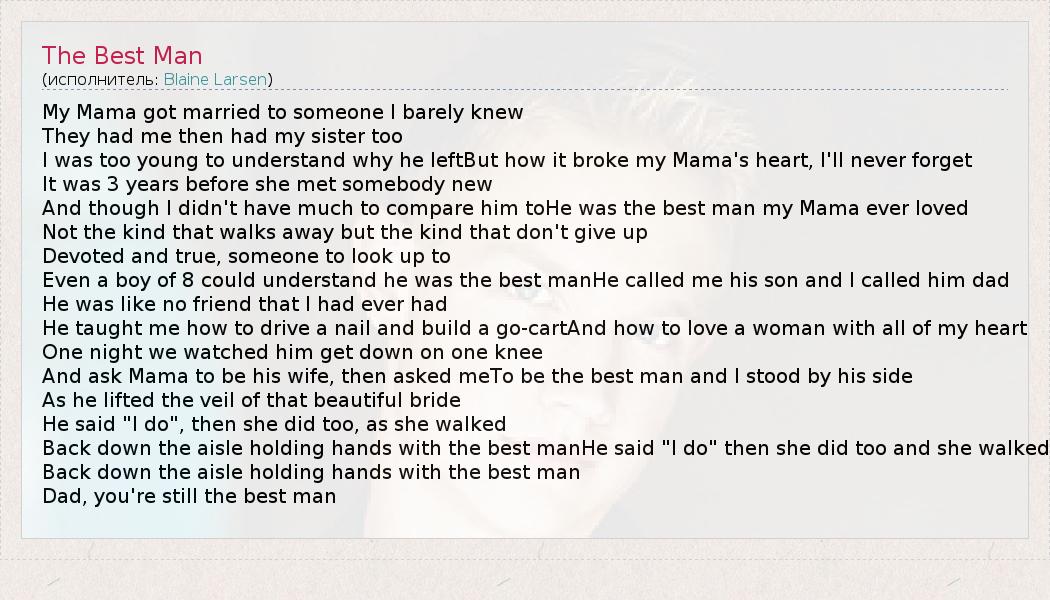 Это интересно:Blaine Larsen (born February 20, 1986 in Tacoma, Washington) is an American country music artist. At age fifteen, he recorded his debut album In My High School on Giantslayer Records, an independent record label. The album was re-issued in 2005 as Off to Join the World by BNA Records. Blaine's second album, Rockin' You Tonight, was issued in June 2006, also on BNA/Giantslayer. Larsen's two albums have produced five chart singles on the Hot Country Songs charts, of which the highest-peaking was "How Do You Get That Lonely" at #18Taken from - http://en.wikipedia.org/wiki/Blaine_Larsen... продолжение