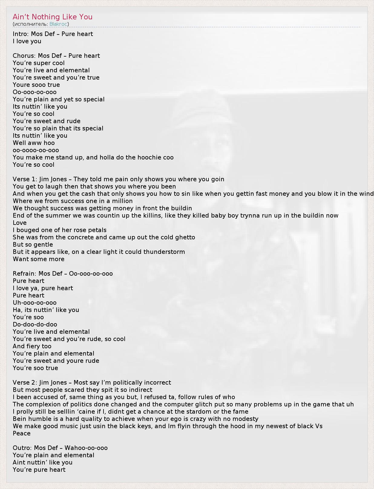 Intro: Mos Def – Pure heart I love you Chorus: Mos Def – Pure heart You’re super cool You’re live and elemental You’re sweet and you’re true Youre sooo true Oo-ooo-oo-ooo You’re plain and yet so special Its nuttin’ like you You’re so cool You’re sweet and rude You’re so plain that its special Its nuttin’ like you Well aww hoo oo-oooo-oo-ooo You make me stand up, and holla do the hoochie coo You’re so cool Verse 1: Jim Jones – They told me pain only shows you where you goin You get to laugh then that shows you where you been And when you get the cash that only shows you how to sin like when you gettin fast money and you blow it in the wind Where we from success one in a million We thought success was getting money in front the buildin End of the summer we was countin up the killins, like they killed baby boy trynna run up in the buildin now Love I bouged one of her rose petals She was from the concrete and came up out the cold ghetto But so gentle But it appears like, on a clear light it could thunderstorm Want some more Refrain: Mos Def – Oo-ooo-oo-ooo Pure heart I love ya, pure heart Pure heart Uh-ooo-oo-ooo Ha, its nuttin’ like you You’re soo Do-doo-do-doo You’re live and elemental You’re sweet and you’re rude, so cool And fiery too You’re plain and elemental You’re sweet and youre rude You’re soo true Verse 2: Jim Jones – Most say I’m politically incorrect But most people scared they spit it so indirect I been accused of, same thing as you but, I refused ta, follow rules of who The complexion of politics done changed and the computer glitch put so many problems up in the game that uh I prolly still be selllin ‘caine if I, didnt get a chance at the stardom or the fame Bein humble is a hard quality to achieve when your ego is crazy with no modesty We make good music just usin the black keys, and Im flyin through the hood in my newest of black Vs Peace Outro: Mos Def – Wahoo-oo-ooo You’re plain and elemental Aint nuttin’ like you You’re pure heart