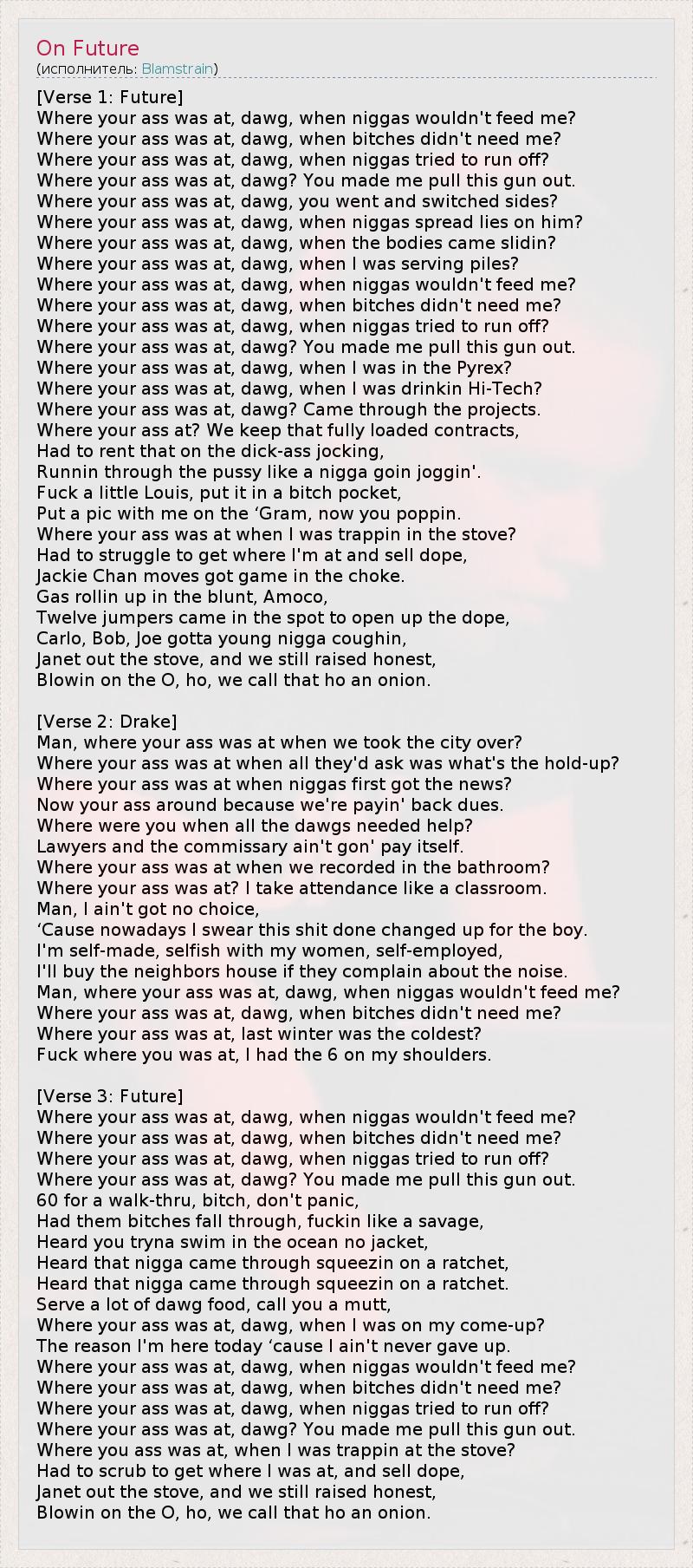 [Verse 1: Future] Where your ass was at, dawg, when niggas wouldn't feed me? Where your ass was at, dawg, when bitches didn't need me? Where your ass was at, dawg, when niggas tried to run off? Where your ass was at, dawg? You made me pull this gun out. Where your ass was at, dawg, you went and switched sides? Where your ass was at, dawg, when niggas spread lies on him? Where your ass was at, dawg, when the bodies came slidin? Where your ass was at, dawg, when I was serving piles? Where your ass was at, dawg, when niggas wouldn't feed me? Where your ass was at, dawg, when bitches didn't need me? Where your ass was at, dawg, when niggas tried to run off? Where your ass was at, dawg? You made me pull this gun out. Where your ass was at, dawg, when I was in the Pyrex? Where your ass was at, dawg, when I was drinkin Hi-Tech? Where your ass was at, dawg? Came through the projects. Where your ass at? We keep that fully loaded contracts, Had to rent that on the dick-ass jocking, Runnin through the pussy like a nigga goin joggin'. Fuck a little Louis, put it in a bitch pocket, Put a pic with me on the ‘Gram, now you poppin. Where your ass was at when I was trappin in the stove? Had to struggle to get where I'm at and sell dope, Jackie Chan moves got game in the choke. Gas rollin up in the blunt, Amoco, Twelve jumpers came in the spot to open up the dope, Carlo, Bob, Joe gotta young nigga coughin, Janet out the stove, and we still raised honest, Blowin on the O, ho, we call that ho an onion. [Verse 2: Drake] Man, where your ass was at when we took the city over? Where your ass was at when all they'd ask was what's the hold-up? Where your ass was at when niggas first got the news? Now your ass around because we're payin' back dues. Where were you when all the dawgs needed help? Lawyers and the commissary ain't gon' pay itself. Where your ass was at when we recorded in the bathroom? Where your ass was at? I take attendance like a classroom. Man, I ain't got no choice, ‘Cause nowadays I swear this shit done changed up for the boy. I'm self-made, selfish with my women, self-employed, I'll buy the neighbors house if they complain about the noise. Man, where your ass was at, dawg, when niggas wouldn't feed me? Where your ass was at, dawg, when bitches didn't need me? Where your ass was at, last winter was the coldest? Fuck where you was at, I had the 6 on my shoulders. [Verse 3: Future] Where your ass was at, dawg, when niggas wouldn't feed me? Where your ass was at, dawg, when bitches didn't need me? Where your ass was at, dawg, when niggas tried to run off? Where your ass was at, dawg? You made me pull this gun out. 60 for a walk-thru, bitch, don't panic, Had them bitches fall through, fuckin like a savage, Heard you tryna swim in the ocean no jacket, Heard that nigga came through squeezin on a ratchet, Heard that nigga came through squeezin on a ratchet. Serve a lot of dawg food, call you a mutt, Where your ass was at, dawg, when I was on my come-up? The reason I'm here today ‘cause I ain't never gave up. Where your ass was at, dawg, when niggas wouldn't feed me? Where your ass was at, dawg, when bitches didn't need me? Where your ass was at, dawg, when niggas tried to run off? Where your ass was at, dawg? You made me pull this gun out. Where you ass was at, when I was trappin at the stove? Had to scrub to get where I was at, and sell dope, Janet out the stove, and we still raised honest, Blowin on the O, ho, we call that ho an onion.