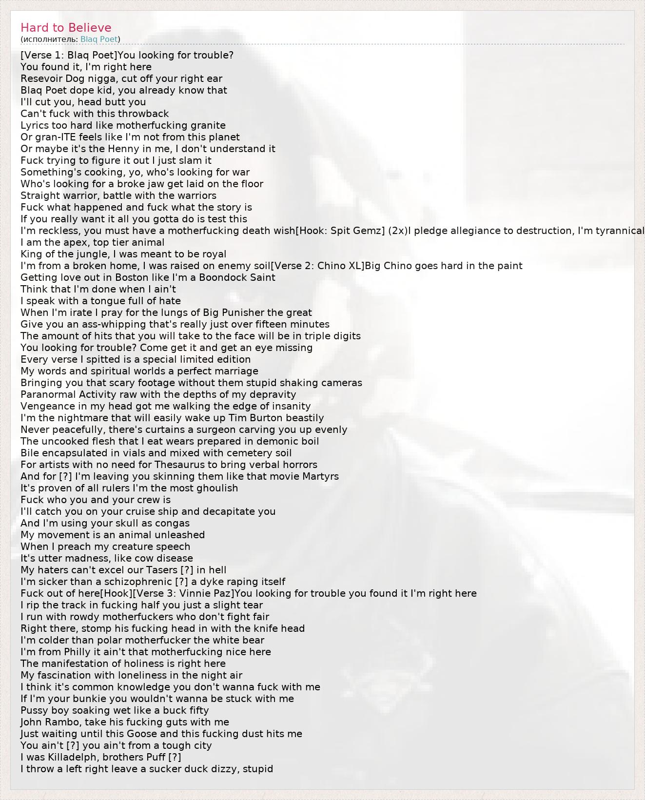 [Verse 1: Blaq Poet]You looking for trouble? You found it, I'm right here Resevoir Dog nigga, cut off your right ear Blaq Poet dope kid, you already know that I'll cut you, head butt you Can't fuck with this throwback Lyrics too hard like motherfucking granite Or gran-ITE feels like I'm not from this planet Or maybe it's the Henny in me, I don't understand it Fuck trying to figure it out I just slam it Something's cooking, yo, who's looking for war Who's looking for a broke jaw get laid on the floor Straight warrior, battle with the warriors Fuck what happened and fuck what the story is If you really want it all you gotta do is test this I'm reckless, you must have a motherfucking death wish[Hook: Spit Gemz] (2x)I pledge allegiance to destruction, I'm tyrannical I am the apex, top tier animal King of the jungle, I was meant to be royal I'm from a broken home, I was raised on enemy soil[Verse 2: Chino XL]Big Chino goes hard in the paint Getting love out in Boston like I'm a Boondock Saint Think that I'm done when I ain't I speak with a tongue full of hate When I'm irate I pray for the lungs of Big Punisher the great Give you an ass-whipping that's really just over fifteen minutes The amount of hits that you will take to the face will be in triple digits You looking for trouble? Come get it and get an eye missing Every verse I spitted is a special limited edition My words and spiritual worlds a perfect marriage Bringing you that scary footage without them stupid shaking cameras Paranormal Activity raw with the depths of my depravity Vengeance in my head got me walking the edge of insanity I'm the nightmare that will easily wake up Tim Burton beastily Never peacefully, there's curtains a surgeon carving you up evenly The uncooked flesh that I eat wears prepared in demonic boil Bile encapsulated in vials and mixed with cemetery soil For artists with no need for Thesaurus to bring verbal horrors And for [?] I'm leaving you skinning them like that movie Martyrs It's proven of all rulers I'm the most ghoulish Fuck who you and your crew is I'll catch you on your cruise ship and decapitate you And I'm using your skull as congas My movement is an animal unleashed When I preach my creature speech It's utter madness, like cow disease My haters can't excel our Tasers [?] in hell I'm sicker than a schizophrenic [?] a dyke raping itself Fuck out of here[Hook][Verse 3: Vinnie Paz]You looking for trouble you found it I'm right here I rip the track in fucking half you just a slight tear I run with rowdy motherfuckers who don't fight fair Right there, stomp his fucking head in with the knife head I'm colder than polar motherfucker the white bear I'm from Philly it ain't that motherfucking nice here The manifestation of holiness is right here My fascination with loneliness in the night air I think it's common knowledge you don't wanna fuck with me If I'm your bunkie you wouldn't wanna be stuck with me Pussy boy soaking wet like a buck fifty John Rambo, take his fucking guts with me Just waiting until this Goose and this fucking dust hits me You ain't [?] you ain't from a tough city I was Killadelph, brothers Puff [?] I throw a left right leave a sucker duck dizzy, stupid