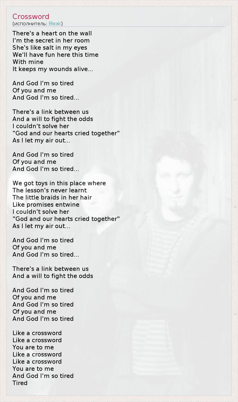There's a heart on the wall I'm the secret in her room She's like salt in my eyes We'll have fun here this time With mine It keeps my wounds alive... And God I'm so tired Of you and me And God I'm so tired... There's a link between us And a will to fight the odds I couldn't solve her "God and our hearts cried together" As I let my air out... And God I'm so tired Of you and me And God I'm so tired... We got toys in this place where The lesson's never learnt The little braids in her hair Like promises entwine I couldn't solve her "God and our hearts cried together" As I let my air out... And God I'm so tired Of you and me And God I'm so tired... There's a link between us And a will to fight the odds And God I'm so tired Of you and me And God I'm so tired Of you and me And God I'm so tired Like a crossword Like a crossword You are to me Like a crossword Like a crossword You are to me And God I'm so tired Tired