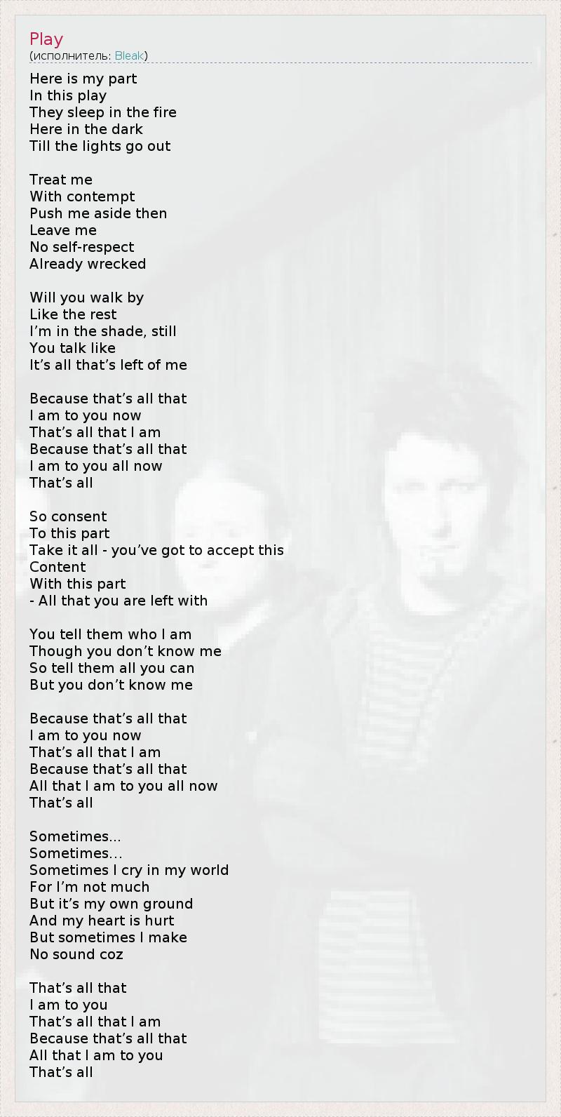 Here is my part In this play They sleep in the fire Here in the dark Till the lights go out Treat me With contempt Push me aside then Leave me No self-respect Already wrecked Will you walk by Like the rest I’m in the shade, still You talk like It’s all that’s left of me Because that’s all that I am to you now That’s all that I am Because that’s all that I am to you all now That’s all So consent To this part Take it all - you’ve got to accept this Content With this part - All that you are left with You tell them who I am Though you don’t know me So tell them all you can But you don’t know me Because that’s all that I am to you now That’s all that I am Because that’s all that All that I am to you all now That’s all Sometimes... Sometimes… Sometimes I cry in my world For I’m not much But it’s my own ground And my heart is hurt But sometimes I make No sound coz That’s all that I am to you That’s all that I am Because that’s all that All that I am to you That’s all