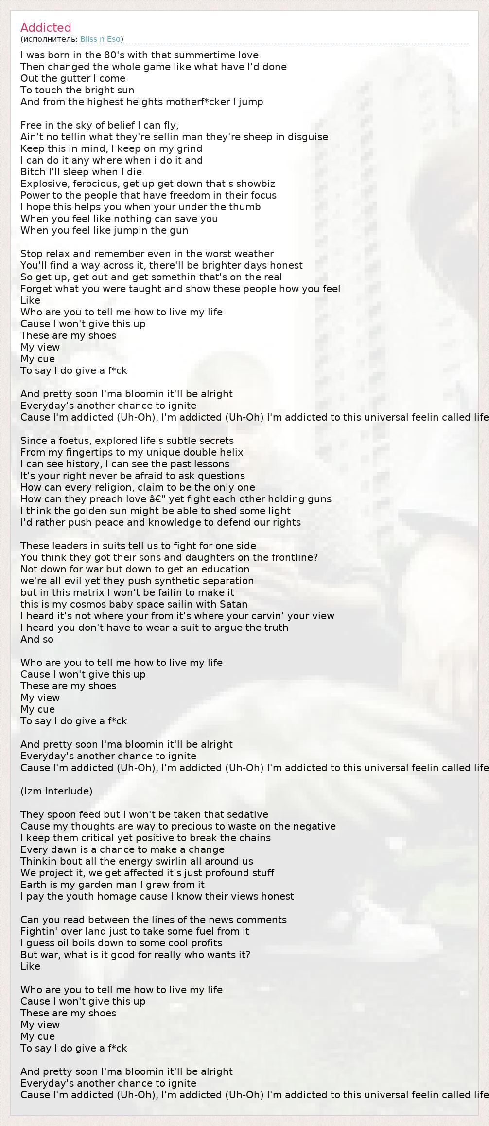 Cause I'm addicted (Uh-Oh), I'm addicted (Uh-Oh) I'm addicted to this universal feelin called life