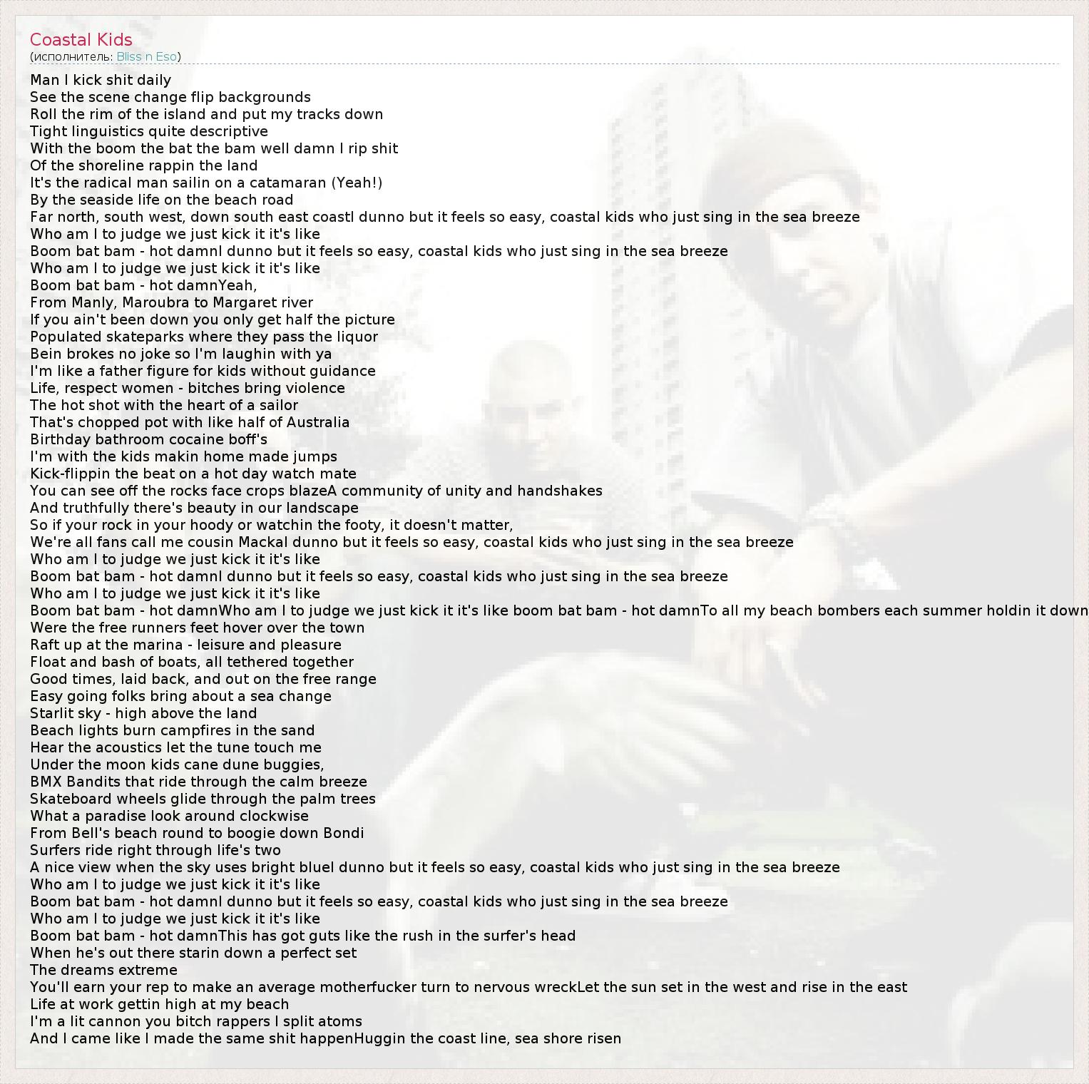 Man I kick shit daily See the scene change flip backgrounds Roll the rim of the island and put my tracks down Tight linguistics quite descriptive With the boom the bat the bam well damn I rip shit Of the shoreline rappin the land It's the radical man sailin on a catamaran (Yeah!) By the seaside life on the beach road Far north, south west, down south east coastI dunno but it feels so easy, coastal kids who just sing in the sea breeze Who am I to judge we just kick it it's like Boom bat bam - hot damnI dunno but it feels so easy, coastal kids who just sing in the sea breeze Who am I to judge we just kick it it's like Boom bat bam - hot damnYeah, From Manly, Maroubra to Margaret river If you ain't been down you only get half the picture Populated skateparks where they pass the liquor Bein brokes no joke so I'm laughin with ya I'm like a father figure for kids without guidance Life, respect women - bitches bring violence The hot shot with the heart of a sailor That's chopped pot with like half of Australia Birthday bathroom cocaine boff's I'm with the kids makin home made jumps Kick-flippin the beat on a hot day watch mate You can see off the rocks face crops blazeA community of unity and handshakes And truthfully there's beauty in our landscape So if your rock in your hoody or watchin the footy, it doesn't matter, We're all fans call me cousin MackaI dunno but it feels so easy, coastal kids who just sing in the sea breeze Who am I to judge we just kick it it's like Boom bat bam - hot damnI dunno but it feels so easy, coastal kids who just sing in the sea breeze Who am I to judge we just kick it it's like Boom bat bam - hot damnWho am I to judge we just kick it it's like boom bat bam - hot damnTo all my beach bombers each summer holdin it down Were the free runners feet hover over the town Raft up at the marina - leisure and pleasure Float and bash of boats, all tethered together Good times, laid back, and out on the free range Easy going folks bring about a sea change Starlit sky - high above the land Beach lights burn campfires in the sand Hear the acoustics let the tune touch me Under the moon kids cane dune buggies, BMX Bandits that ride through the calm breeze Skateboard wheels glide through the palm trees What a paradise look around clockwise From Bell's beach round to boogie down Bondi Surfers ride right through life's two A nice view when the sky uses bright blueI dunno but it feels so easy, coastal kids who just sing in the sea breeze Who am I to judge we just kick it it's like Boom bat bam - hot damnI dunno but it feels so easy, coastal kids who just sing in the sea breeze Who am I to judge we just kick it it's like Boom bat bam - hot damnThis has got guts like the rush in the surfer's head When he's out there starin down a perfect set The dreams extreme You'll earn your rep to make an average motherfucker turn to nervous wreckLet the sun set in the west and rise in the east Life at work gettin high at my beach I'm a lit cannon you bitch rappers I split atoms And I came like I made the same shit happenHuggin the coast line, sea shore risen