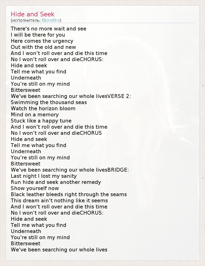 There's no more wait and see I will be there for you Here comes the urgency Out with the old and new And I won't roll over and die this time No I won't roll over and dieCHORUS: Hide and seek Tell me what you find Underneath You're still on my mind Bittersweet We've been searching our whole livesVERSE 2: Swimming the thousand seas Watch the horizon bloom Mind on a memory Stuck like a happy tune And I won't roll over and die this time No I won't roll over and dieCHORUS Hide and seek Tell me what you find Underneath You're still on my mind Bittersweet We've been searching our whole livesBRIDGE: Last night I lost my sanity Run hide and seek another remedy Show yourself now Black leather bleeds right through the seams This dream ain't nothing like it seems And I won't roll over and die this time No I won't roll over and dieCHORUS: Hide and seek Tell me what you find Underneath You're still on my mind Bittersweet We've been searching our whole lives