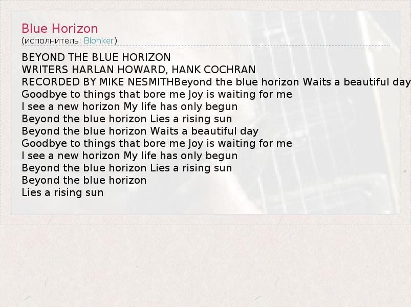 RECORDED BY MIKE NESMITHBeyond the blue horizon Waits a beautiful day