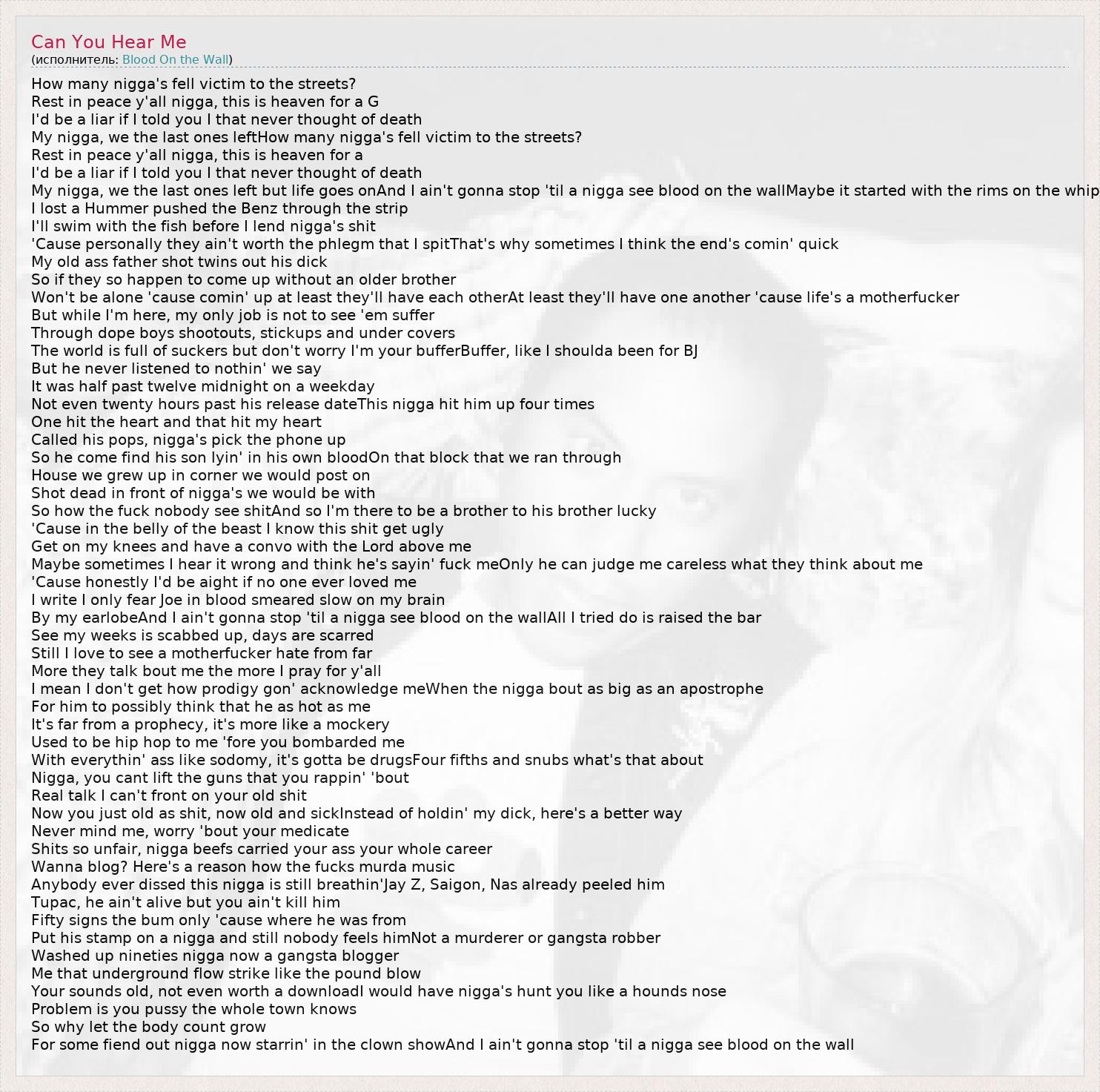 How many nigga's fell victim to the streets? Rest in peace y'all nigga, this is heaven for a G I'd be a liar if I told you I that never thought of death My nigga, we the last ones leftHow many nigga's fell victim to the streets? Rest in peace y'all nigga, this is heaven for a I'd be a liar if I told you I that never thought of death My nigga, we the last ones left but life goes onAnd I ain't gonna stop 'til a nigga see blood on the wallMaybe it started with the rims on the whip I lost a Hummer pushed the Benz through the strip I'll swim with the fish before I lend nigga's shit 'Cause personally they ain't worth the phlegm that I spitThat's why sometimes I think the end's comin' quick My old ass father shot twins out his dick So if they so happen to come up without an older brother Won't be alone 'cause comin' up at least they'll have each otherAt least they'll have one another 'cause life's a motherfucker But while I'm here, my only job is not to see 'em suffer Through dope boys shootouts, stickups and under covers The world is full of suckers but don't worry I'm your bufferBuffer, like I shoulda been for BJ But he never listened to nothin' we say It was half past twelve midnight on a weekday Not even twenty hours past his release dateThis nigga hit him up four times One hit the heart and that hit my heart Called his pops, nigga's pick the phone up So he come find his son lyin' in his own bloodOn that block that we ran through House we grew up in corner we would post on Shot dead in front of nigga's we would be with So how the fuck nobody see shitAnd so I'm there to be a brother to his brother lucky 'Cause in the belly of the beast I know this shit get ugly Get on my knees and have a convo with the Lord above me Maybe sometimes I hear it wrong and think he's sayin' fuck meOnly he can judge me careless what they think about me 'Cause honestly I'd be aight if no one ever loved me I write I only fear Joe in blood smeared slow on my brain By my earlobeAnd I ain't gonna stop 'til a nigga see blood on the wallAll I tried do is raised the bar See my weeks is scabbed up, days are scarred Still I love to see a motherfucker hate from far More they talk bout me the more I pray for y'all I mean I don't get how prodigy gon' acknowledge meWhen the nigga bout as big as an apostrophe For him to possibly think that he as hot as me It's far from a prophecy, it's more like a mockery Used to be hip hop to me 'fore you bombarded me With everythin' ass like sodomy, it's gotta be drugsFour fifths and snubs what's that about Nigga, you cant lift the guns that you rappin' 'bout Real talk I can't front on your old shit Now you just old as shit, now old and sickInstead of holdin' my dick, here's a better way Never mind me, worry 'bout your medicate Shits so unfair, nigga beefs carried your ass your whole career Wanna blog? Here's a reason how the fucks murda music Anybody ever dissed this nigga is still breathin'Jay Z, Saigon, Nas already peeled him Tupac, he ain't alive but you ain't kill him Fifty signs the bum only 'cause where he was from Put his stamp on a nigga and still nobody feels himNot a murderer or gangsta robber Washed up nineties nigga now a gangsta blogger Me that underground flow strike like the pound blow Your sounds old, not even worth a downloadI would have nigga's hunt you like a hounds nose Problem is you pussy the whole town knows So why let the body count grow For some fiend out nigga now starrin' in the clown showAnd I ain't gonna stop 'til a nigga see blood on the wall