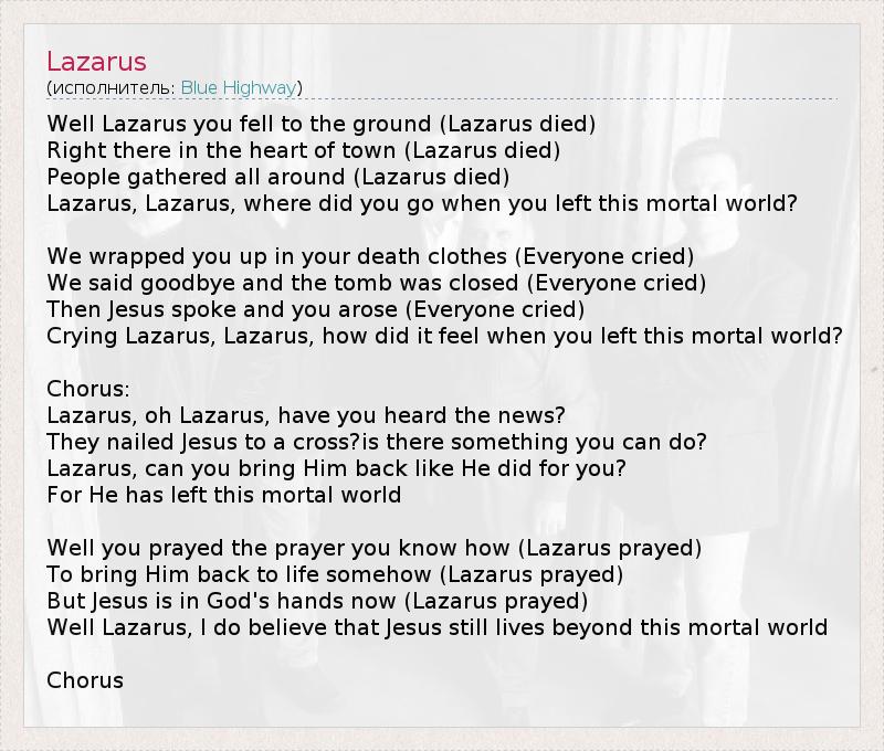 Well Lazarus you fell to the ground (Lazarus died) Right there in the heart of town (Lazarus died) People gathered all around (Lazarus died) Lazarus, Lazarus, where did you go when you left this mortal world? We wrapped you up in your death clothes (Everyone cried) We said goodbye and the tomb was closed (Everyone cried) Then Jesus spoke and you arose (Everyone cried) Crying Lazarus, Lazarus, how did it feel when you left this mortal world? Chorus: Lazarus, oh Lazarus, have you heard the news? They nailed Jesus to a cross?is there something you can do? Lazarus, can you bring Him back like He did for you? For He has left this mortal world Well you prayed the prayer you know how (Lazarus prayed) To bring Him back to life somehow (Lazarus prayed) But Jesus is in God's hands now (Lazarus prayed) Well Lazarus, I do believe that Jesus still lives beyond this mortal world Chorus