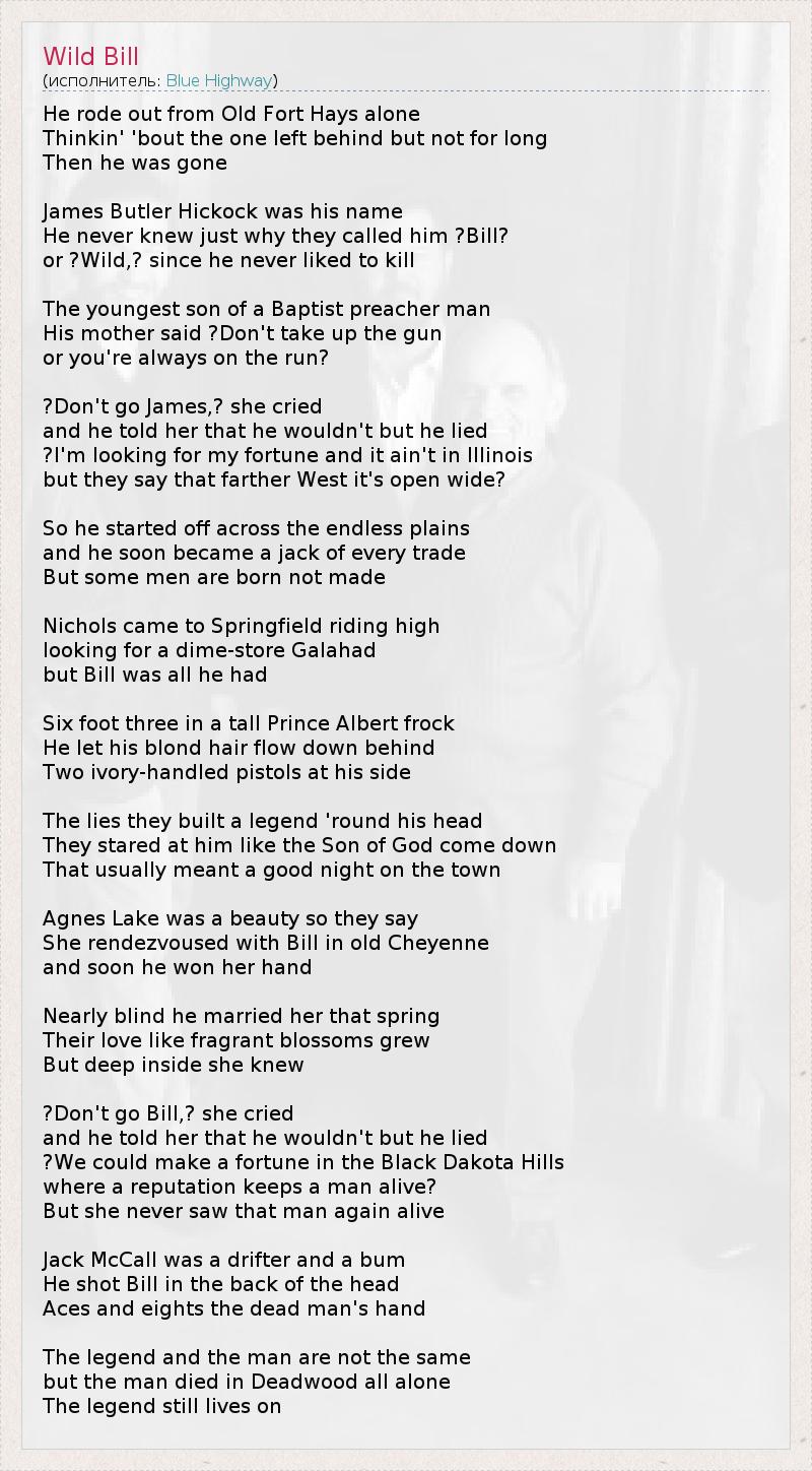 He rode out from Old Fort Hays alone Thinkin' 'bout the one left behind but not for long Then he was gone James Butler Hickock was his name He never knew just why they called him ?Bill? or ?Wild,? since he never liked to kill The youngest son of a Baptist preacher man His mother said ?Don't take up the gun or you're always on the run? ?Don't go James,? she cried and he told her that he wouldn't but he lied ?I'm looking for my fortune and it ain't in Illinois but they say that farther West it's open wide? So he started off across the endless plains and he soon became a jack of every trade But some men are born not made Nichols came to Springfield riding high looking for a dime-store Galahad but Bill was all he had Six foot three in a tall Prince Albert frock He let his blond hair flow down behind Two ivory-handled pistols at his side The lies they built a legend 'round his head They stared at him like the Son of God come down That usually meant a good night on the town Agnes Lake was a beauty so they say She rendezvoused with Bill in old Cheyenne and soon he won her hand Nearly blind he married her that spring Their love like fragrant blossoms grew But deep inside she knew ?Don't go Bill,? she cried and he told her that he wouldn't but he lied ?We could make a fortune in the Black Dakota Hills where a reputation keeps a man alive? But she never saw that man again alive Jack McCall was a drifter and a bum He shot Bill in the back of the head Aces and eights the dead man's hand The legend and the man are not the same but the man died in Deadwood all alone The legend still lives on