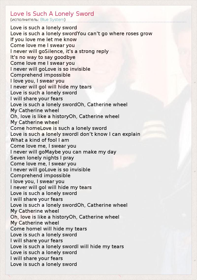 Love is such a lonely sword Love is such a lonely swordYou can't go where roses grow If you love me let me know Come love me I swear you I never will goSilence, it's a strong reply It's no way to say goodbye Come love me I swear you I never will goLove is so invisible Comprehend impossible I love you, I swear you I never will goI will hide my tears Love is such a lonely sword I will share your fears Love is such a lonely swordOh, Catherine wheel My Catherine wheel Oh, love is like a historyOh, Catherine wheel My Catherine wheel Come homeLove is such a lonely sword Love is such a lonely swordI don't know I can explain What a kind of fool I am Come love me, I swear you I never will goMaybe you can make my day Seven lonely nights I pray Come love me, I swear you I never will goLove is so invisible Comprehend impossible I love you, I swear you I never will goI will hide my tears Love is such a lonely sword I will share your fears Love is such a lonely swordOh, Catherine wheel My Catherine wheel Oh, love is like a historyOh, Catherine wheel My Catherine wheel Come homeI will hide my tears Love is such a lonely sword I will share your fears Love is such a lonely swordI will hide my tears Love is such a lonely sword I will share your fears Love is such a lonely sword