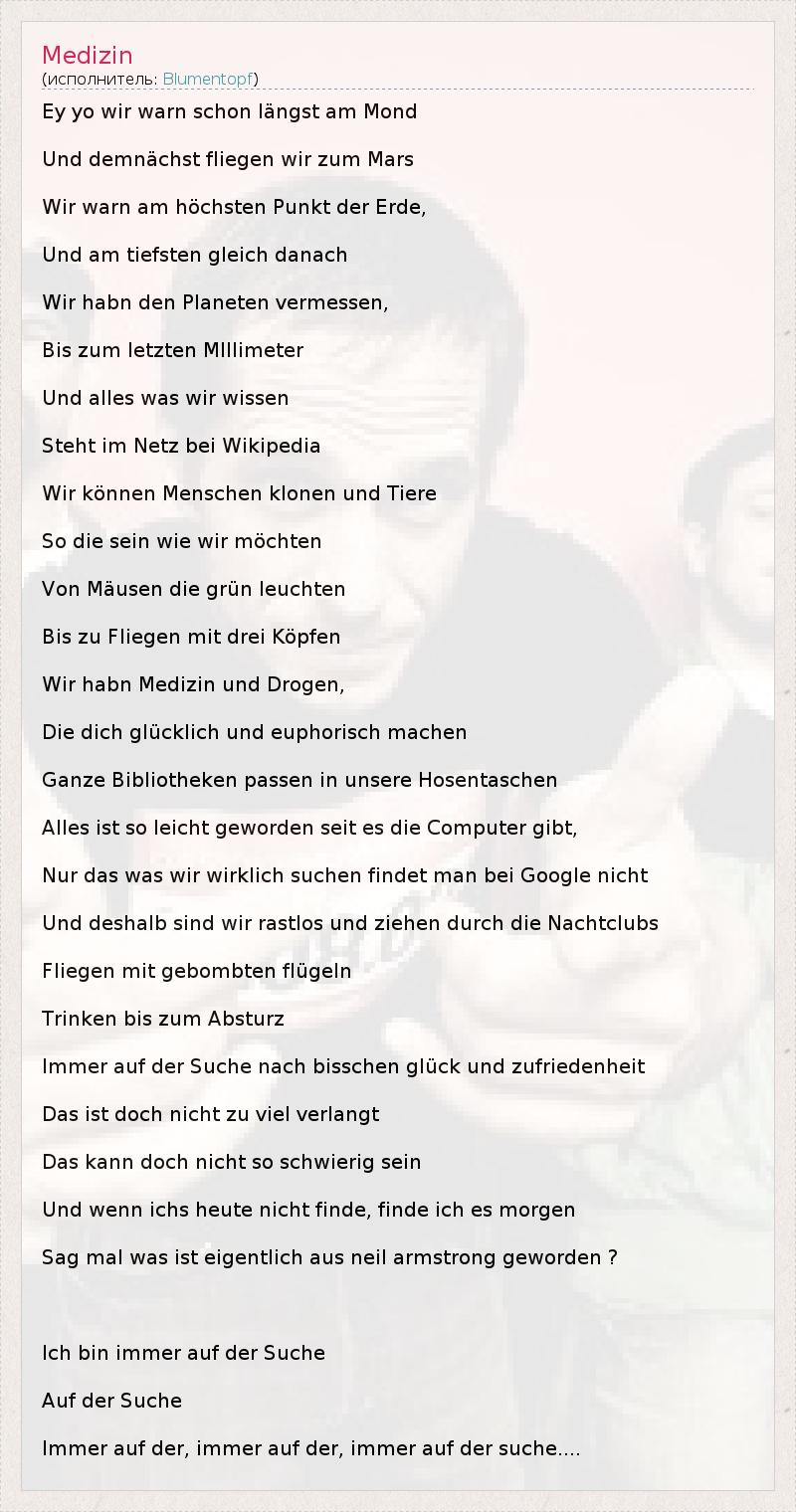 Ey yo wir warn schon längst am Mond Und demnächst fliegen wir zum Mars Wir warn am höchsten Punkt der Erde, Und am tiefsten gleich danach Wir habn den Planeten vermessen, Bis zum letzten MIllimeter Und alles was wir wissen Steht im Netz bei Wikipedia Wir können Menschen klonen und Tiere So die sein wie wir möchten Von Mäusen die grün leuchten Bis zu Fliegen mit drei Köpfen Wir habn Medizin und Drogen, Die dich glücklich und euphorisch machen Ganze Bibliotheken passen in unsere Hosentaschen Alles ist so leicht geworden seit es die Computer gibt, Nur das was wir wirklich suchen findet man bei Google nicht Und deshalb sind wir rastlos und ziehen durch die Nachtclubs Fliegen mit gebombten flügeln Trinken bis zum Absturz Immer auf der Suche nach bisschen glück und zufriedenheit Das ist doch nicht zu viel verlangt Das kann doch nicht so schwierig sein Und wenn ichs heute nicht finde, finde ich es morgen Sag mal was ist eigentlich aus neil armstrong geworden ? Ich bin immer auf der Suche Auf der Suche Immer auf der, immer auf der, immer auf der suche....