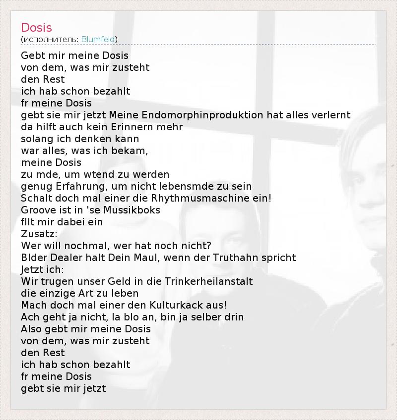 Gebt mir meine Dosis von dem, was mir zusteht den Rest ich hab schon bezahlt fr meine Dosis gebt sie mir jetzt Meine Endomorphinproduktion hat alles verlernt da hilft auch kein Erinnern mehr solang ich denken kann war alles, was ich bekam, meine Dosis zu mde, um wtend zu werden genug Erfahrung, um nicht lebensmde zu sein Schalt doch mal einer die Rhythmusmaschine ein! Groove ist in 'se Mussikboks fllt mir dabei ein Zusatz: Wer will nochmal, wer hat noch nicht? Blder Dealer halt Dein Maul, wenn der Truthahn spricht Jetzt ich: Wir trugen unser Geld in die Trinkerheilanstalt die einzige Art zu leben Mach doch mal einer den Kulturkack aus! Ach geht ja nicht, la blo an, bin ja selber drin Also gebt mir meine Dosis von dem, was mir zusteht den Rest ich hab schon bezahlt fr meine Dosis gebt sie mir jetzt