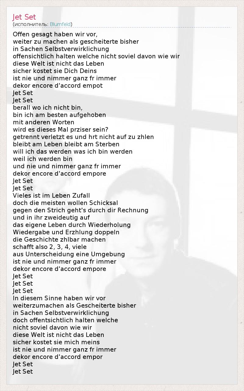 Offen gesagt haben wir vor, weiter zu machen als gescheiterte bisher in Sachen Selbstverwirklichung offensichtlich halten welche nicht soviel davon wie wir diese Welt ist nicht das Leben sicher kostet sie Dich Deins ist nie und nimmer ganz fr immer dekor encore d'accord empot Jet Set Jet Set berall wo ich nicht bin, bin ich am besten aufgehoben mit anderen Worten wird es dieses Mal prziser sein? getrennt verletzt es und hrt nicht auf zu zhlen bleibt am Leben bleibt am Sterben will ich das werden was ich bin werden weil ich werden bin und nie und nimmer ganz fr immer dekor encore d'accord empore Jet Set Jet Set Vieles ist im Leben Zufall doch die meisten wollen Schicksal gegen den Strich geht's durch dir Rechnung und in ihr zweideutig auf das eigene Leben durch Wiederholung Wiedergabe und Erzhlung doppeln die Geschichte zhlbar machen schafft also 2, 3, 4, viele aus Unterscheidung eine Umgebung ist nie und nimmer ganz fr immer dekor encore d'accord empore Jet Set Jet Set Jet Set In diesem Sinne haben wir vor weiterzumachen als Gescheiterte bisher in Sachen Selbstverwirklichung doch offentsichtlich halten welche nicht soviel davon wie wir diese Welt ist nicht das Leben sicher kostet sie mich meins ist nie und nimmer ganz fr immer dekor encore d'accord empor Jet Set Jet Set