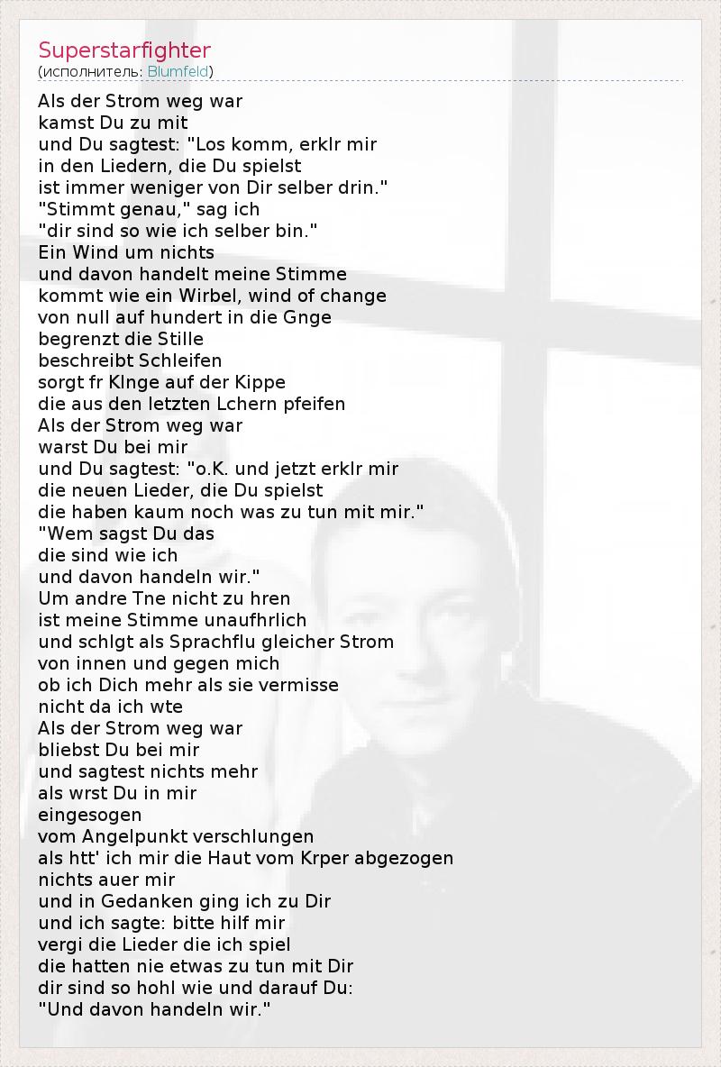 Это интересно:Blumfeld - немецкая инди-поп-группа из Гамбурга , Германия. Образованная певцом и автором песен Jochen Distelmeyer. Название группы было придумано по главному герою рассказа Франца Кафки "Blumfeld, ein älterer Junggeselle" . Blumfeld считаются одними из самых значительных представителей Hamburger Schule (школа Гамбурга) и считаются одними из самых успешных исполнителей из немецкой инди-сцены.Музыка Blumfeld's характеризуется... продолжение