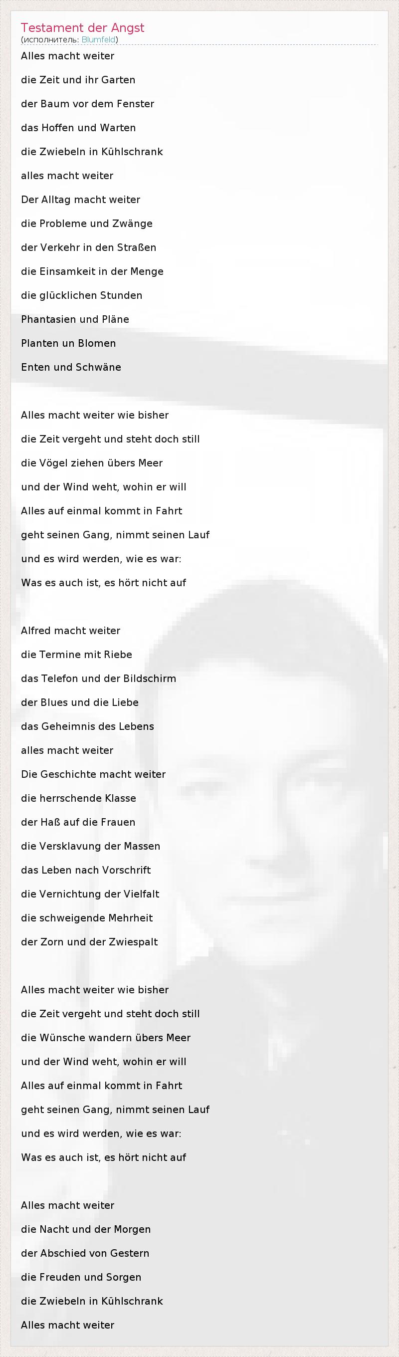 Alles macht weiter die Zeit und ihr Garten der Baum vor dem Fenster das Hoffen und Warten die Zwiebeln in Kühlschrank alles macht weiter Der Alltag macht weiter die Probleme und Zwänge der Verkehr in den Straßen die Einsamkeit in der Menge die glücklichen Stunden Phantasien und Pläne Planten un Blomen Enten und Schwäne Alles macht weiter wie bisher die Zeit vergeht und steht doch still die Vögel ziehen übers Meer und der Wind weht, wohin er will Alles auf einmal kommt in Fahrt geht seinen Gang, nimmt seinen Lauf und es wird werden, wie es war: Was es auch ist, es hört nicht auf Alfred macht weiter die Termine mit Riebe das Telefon und der Bildschirm der Blues und die Liebe das Geheimnis des Lebens alles macht weiter Die Geschichte macht weiter die herrschende Klasse der Haß auf die Frauen die Versklavung der Massen das Leben nach Vorschrift die Vernichtung der Vielfalt die schweigende Mehrheit der Zorn und der Zwiespalt Alles macht weiter wie bisher die Zeit vergeht und steht doch still die Wünsche wandern übers Meer und der Wind weht, wohin er will Alles auf einmal kommt in Fahrt geht seinen Gang, nimmt seinen Lauf und es wird werden, wie es war: Was es auch ist, es hört nicht auf Alles macht weiter die Nacht und der Morgen der Abschied von Gestern die Freuden und Sorgen die Zwiebeln in Kühlschrank Alles macht weiter