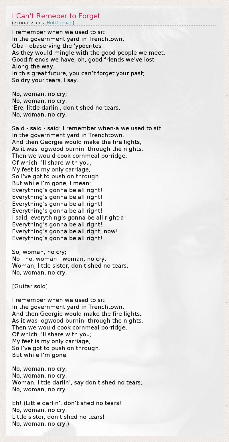 Я помню, как мы частенько сидели Во дворе дома правительства в Тренчтауне, Наблюдая за ханжами, Как они смешивались с хорошими людьми, которых мы знали. У нас есть хорошие друзья, но некоторых из них мы потеряли По дороге сюда. И в этом великом будущем ты не сможешь забыть своего прошлого, Поэтому вытри слезы, я тебе говорю. Нет, женщина, не плачь, Нет, женщина, не плачь. И больше никогда, дорогая, не роняй слезы, Нет, женщина, не плачь... Я помню, как мы частенько сидели Во дворе дома правительства в Тренчтауне, А затем Джорджи разжигал костёр, В котором из ночи в ночь горело кампешевое дерево. Затем мы готовили кашу из кукурузной муки, Которой я поделюсь с тобой. Мои ступни – мое единственное средство передвижения, Поэтому я должен спешить вперед. Но пока меня не будет, я хочу, чтобы ты знала: Все будет хорошо! Все будет хорошо! Все будет хорошо! Все будет хорошо! Я говорю – все будет хорошо! Все будет хорошо! Все будет хорошо! Все будет хорошо! Поэтому, женщина, не плачь, Нет-нет, женщина, не плачь, Женщина, сестренка, не роняй слезы, Нет, женщина, не плачь... [Проигрыш на гитаре] Я помню, как мы частенько сидели Во дворе дома правительства в Тренчтауне, А затем Джорджи разжигал костёр, В котором из ночи в ночь горело кампешевое дерево. Затем мы готовили кашу из кукурузной муки, Которой я поделюсь с тобой. Мои ступни – мое единственное средство передвижения, Поэтому я должен спешить вперед. Но пока меня не будет: Нет, женщина, не плачь, Нет, женщина, не плачь, И больше никогда, дорогая, не роняй слезы, Нет, женщина, не плачь... Да! (Дорогая, не лей слезы), Нет, женщина, не плачь, Маленькая сестренка, не роняй слезы, Нет, женщина, не плачь...