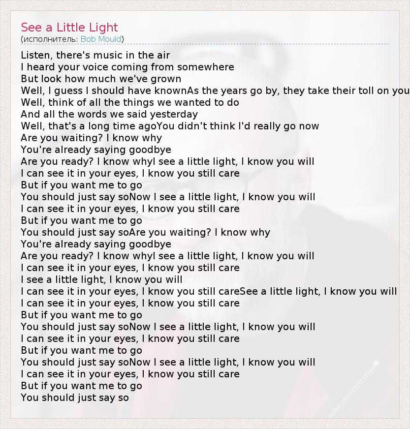 Listen, there's music in the air I heard your voice coming from somewhere But look how much we've grown Well, I guess I should have knownAs the years go by, they take their toll on you Well, think of all the things we wanted to do And all the words we said yesterday Well, that's a long time agoYou didn't think I'd really go now Are you waiting? I know why You're already saying goodbye Are you ready? I know whyI see a little light, I know you will I can see it in your eyes, I know you still care But if you want me to go You should just say soNow I see a little light, I know you will I can see it in your eyes, I know you still care But if you want me to go You should just say soAre you waiting? I know why You're already saying goodbye Are you ready? I know whyI see a little light, I know you will I can see it in your eyes, I know you still care I see a little light, I know you will I can see it in your eyes, I know you still careSee a little light, I know you will I can see it in your eyes, I know you still care But if you want me to go You should just say soNow I see a little light, I know you will I can see it in your eyes, I know you still care But if you want me to go You should just say soNow I see a little light, I know you will I can see it in your eyes, I know you still care But if you want me to go You should just say so