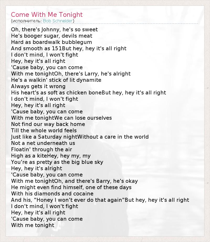 Oh, there's Johnny, he's so sweet He's booger sugar, devils meat Hard as boardwalk bubblegum And smooth as 151But hey, hey it's all right I don't mind, I won't fight Hey, hey it's all right 'Cause baby, you can come With me tonightOh, there's Larry, he's alright He's a walkin' stick of lit dynamite Always gets it wrong His heart's as soft as chicken boneBut hey, hey it's all right I don't mind, I won't fight Hey, hey it's all right 'Cause baby, you can come With me tonightWe can lose ourselves Not find our way back home Till the whole world feels Just like a Saturday nightWithout a care in the world Not a net underneath us Floatin' through the air High as a kiteHey, hey my, my You're as pretty as the big blue sky Hey, hey it's alright 'Cause baby, you can come With me tonightOh, and there's Barry, he's okay He might even find himself, one of these days With his diamonds and cocaine And his, "Honey I won't ever do that again"But hey, hey it's all right I don't mind, I won't fight Hey, hey it's all right 'Cause baby, you can come With me tonight