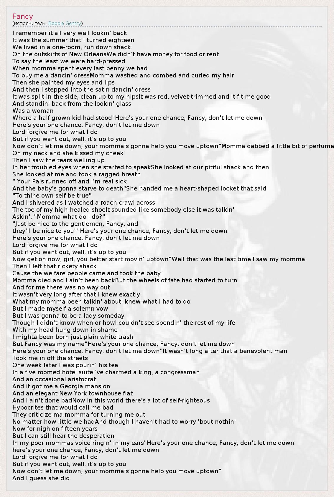 I remember it all very well lookin' back It was the summer that I turned eighteen We lived in a one-room, run down shack On the outskirts of New OrleansWe didn't have money for food or rent To say the least we were hard-pressed When momma spent every last penny we had To buy me a dancin' dressMomma washed and combed and curled my hair Then she painted my eyes and lips And then I stepped into the satin dancin' dress It was split in the side, clean up to my hipsIt was red, velvet-trimmed and it fit me good And standin' back from the lookin' glass Was a woman Where a half grown kid had stood"Here's your one chance, Fancy, don't let me down Here's your one chance, Fancy, don't let me down Lord forgive me for what I do But if you want out, well, it's up to you Now don't let me down, your momma's gonna help you move uptown"Momma dabbed a little bit of perfume On my neck and she kissed my cheek Then I saw the tears welling up In her troubled eyes when she started to speakShe looked at our pitiful shack and then She looked at me and took a ragged breath " Your Pa's runned off and I'm real sick And the baby's gonna starve to death"She handed me a heart-shaped locket that said "To thine own self be true" And I shivered as I watched a roach crawl across The toe of my high-healed shoeIt sounded like somebody else it was talkin' Askin', "Momma what do I do?" "Just be nice to the gentlemen, Fancy, and they'll be nice to you""Here's your one chance, Fancy, don't let me down Here's your one chance, Fancy, don't let me down Lord forgive me for what I do But if you want out, well, it's up to you Now get on now, girl, you better start movin' uptown"Well that was the last time I saw my momma Then I left that rickety shack Cause the welfare people came and took the baby Momma died and I ain't been backBut the wheels of fate had started to turn And for me there was no way out It wasn't very long after that I knew exactly What my momma been talkin' aboutI knew what I had to do But I made myself a solemn vow But I was gonna to be a lady someday Though I didn't know when or howI couldn't see spendin' the rest of my life With my head hung down in shame I mighta been born just plain white trash But Fancy was my name"Here's your one chance, Fancy, don't let me down Here's your one chance, Fancy, don't let me down"It wasn't long after that a benevolent man Took me in off the streets One week later I was pourin' his tea In a five roomed hotel suiteI've charmed a king, a congressman And an occasional aristocrat And it got me a Georgia mansion And an elegant New York townhouse flat And I ain't done badNow in this world there's a lot of self-righteous Hypocrites that would call me bad They criticize ma momma for turning me out No matter how little we hadAnd though I haven't had to worry 'bout nothin' Now for nigh on fifteen years But I can still hear the desperation In my poor mommas voice ringin' in my ears"Here's your one chance, Fancy, don't let me down here's your one chance, Fancy, don't let me down Lord forgive me for what I do But if you want out, well, it's up to you Now don't let me down, your momma's gonna help you move uptown" And I guess she did