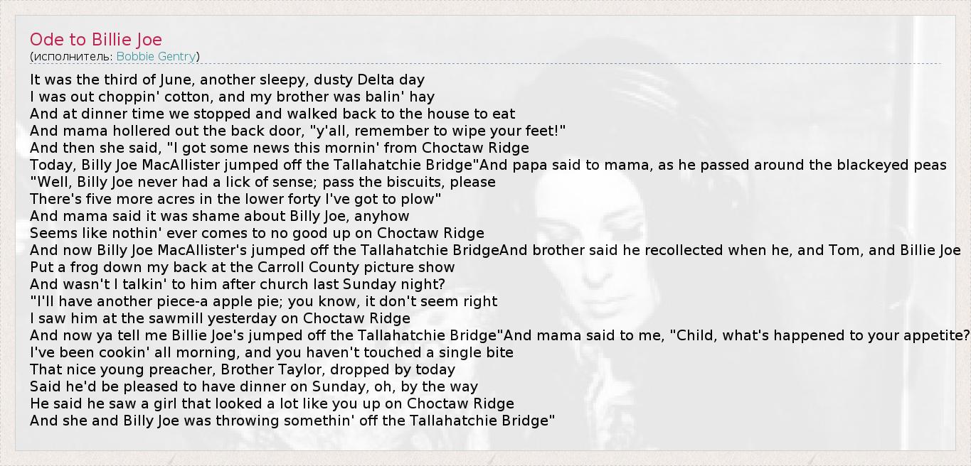 Today, Billy Joe MacAllister jumped off the Tallahatchie Bridge"And papa said to mama, as he passed around the blackeyed peas