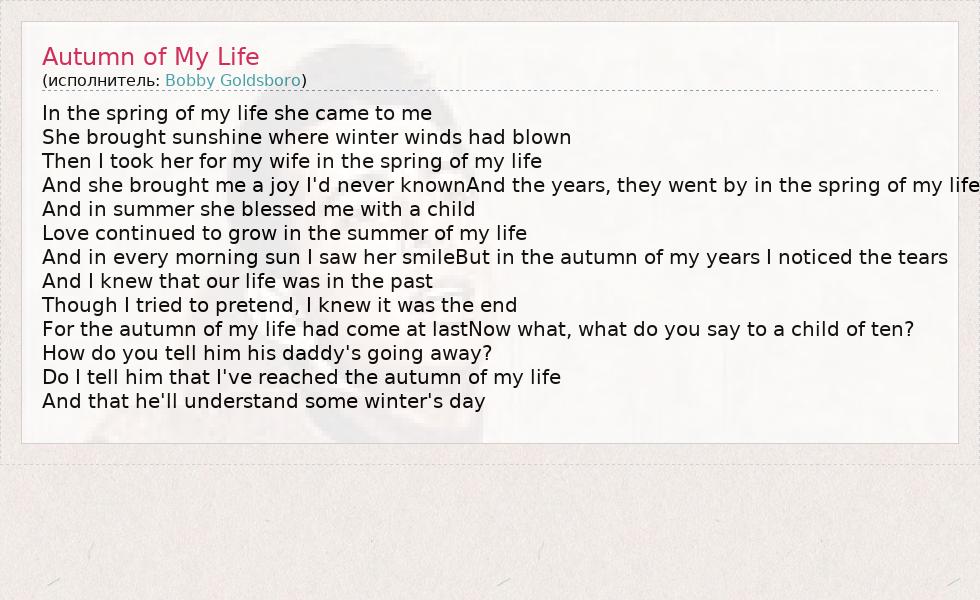 In the spring of my life she came to me She brought sunshine where winter winds had blown Then I took her for my wife in the spring of my life And she brought me a joy I'd never knownAnd the years, they went by in the spring of my life And in summer she blessed me with a child Love continued to grow in the summer of my life And in every morning sun I saw her smileBut in the autumn of my years I noticed the tears And I knew that our life was in the past Though I tried to pretend, I knew it was the end For the autumn of my life had come at lastNow what, what do you say to a child of ten? How do you tell him his daddy's going away? Do I tell him that I've reached the autumn of my life And that he'll understand some winter's day
