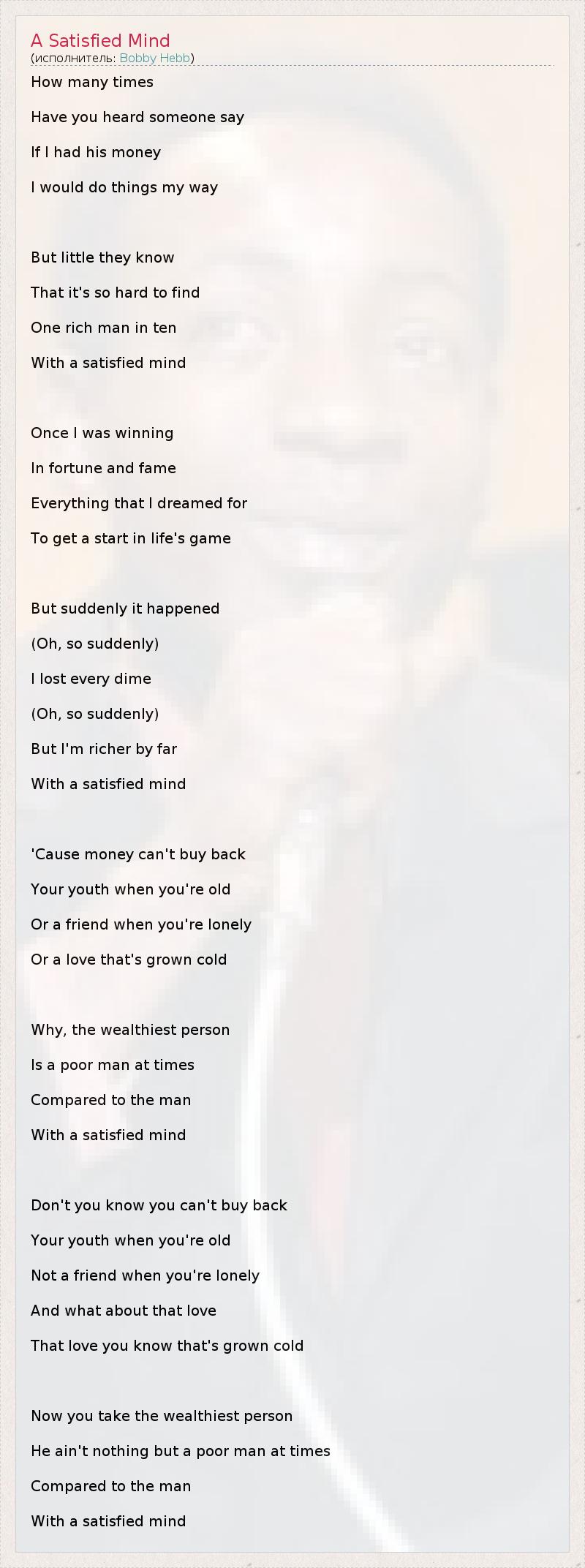 How many times Have you heard someone say If I had his money I would do things my way But little they know That it's so hard to find One rich man in ten With a satisfied mind Once I was winning In fortune and fame Everything that I dreamed for To get a start in life's game But suddenly it happened (Oh, so suddenly) I lost every dime (Oh, so suddenly) But I'm richer by far With a satisfied mind 'Cause money can't buy back Your youth when you're old Or a friend when you're lonely Or a love that's grown cold Why, the wealthiest person Is a poor man at times Compared to the man With a satisfied mind Don't you know you can't buy back Your youth when you're old Not a friend when you're lonely And what about that love That love you know that's grown cold Now you take the wealthiest person He ain't nothing but a poor man at times Compared to the man With a satisfied mind