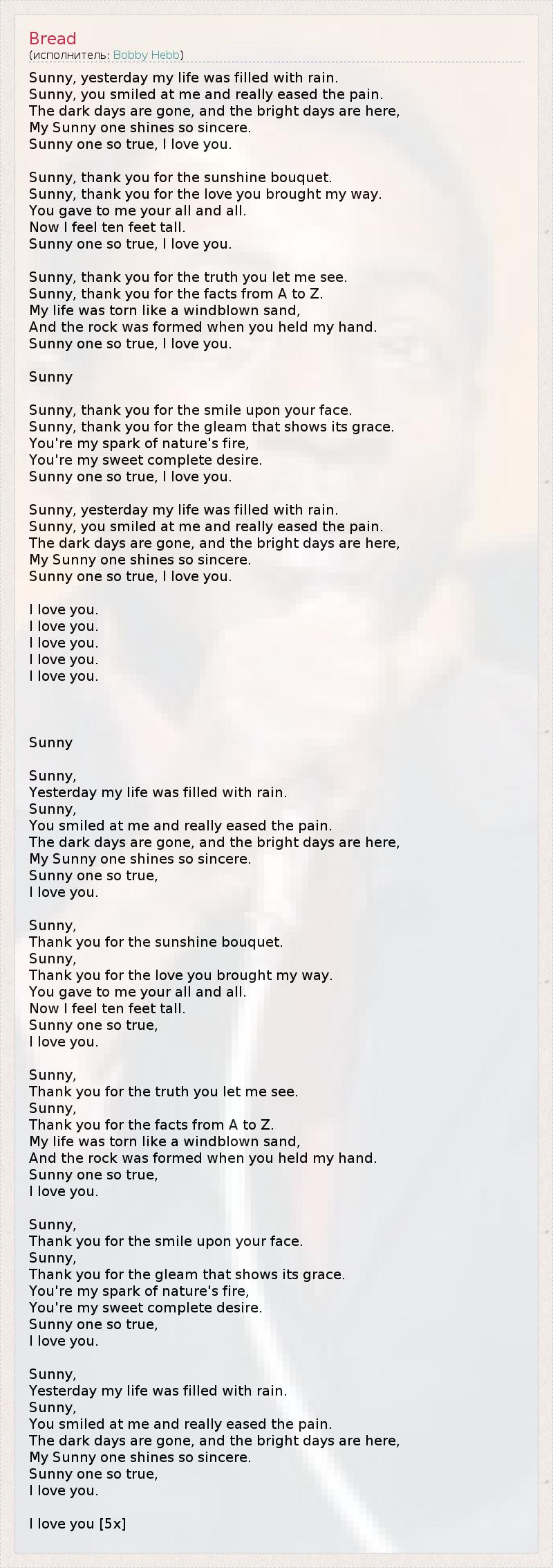 Sunny, yesterday my life was filled with rain. Sunny, you smiled at me and really eased the pain. The dark days are gone, and the bright days are here, My Sunny one shines so sincere. Sunny one so true, I love you. Sunny, thank you for the sunshine bouquet. Sunny, thank you for the love you brought my way. You gave to me your all and all. Now I feel ten feet tall. Sunny one so true, I love you. Sunny, thank you for the truth you let me see. Sunny, thank you for the facts from A to Z. My life was torn like a windblown sand, And the rock was formed when you held my hand. Sunny one so true, I love you. Sunny Sunny, thank you for the smile upon your face. Sunny, thank you for the gleam that shows its grace. You're my spark of nature's fire, You're my sweet complete desire. Sunny one so true, I love you. Sunny, yesterday my life was filled with rain. Sunny, you smiled at me and really eased the pain. The dark days are gone, and the bright days are here, My Sunny one shines so sincere. Sunny one so true, I love you. I love you. I love you. I love you. I love you. I love you. Sunny Sunny, Yesterday my life was filled with rain. Sunny, You smiled at me and really eased the pain. The dark days are gone, and the bright days are here, My Sunny one shines so sincere. Sunny one so true, I love you. Sunny, Thank you for the sunshine bouquet. Sunny, Thank you for the love you brought my way. You gave to me your all and all. Now I feel ten feet tall. Sunny one so true, I love you. Sunny, Thank you for the truth you let me see. Sunny, Thank you for the facts from A to Z. My life was torn like a windblown sand, And the rock was formed when you held my hand. Sunny one so true, I love you. Sunny, Thank you for the smile upon your face. Sunny, Thank you for the gleam that shows its grace. You're my spark of nature's fire, You're my sweet complete desire. Sunny one so true, I love you. Sunny, Yesterday my life was filled with rain. Sunny, You smiled at me and really eased the pain. The dark days are gone, and the bright days are here, My Sunny one shines so sincere. Sunny one so true, I love you. I love you [5x]