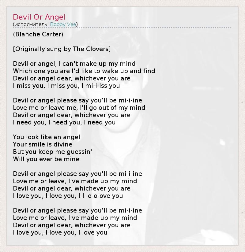 (Blanche Carter) [Originally sung by The Clovers] Devil or angel, I can't make up my mind Which one you are I'd like to wake up and find Devil or angel dear, whichever you are I miss you, I miss you, I mi-i-iss you Devil or angel please say you'll be mi-i-ine Love me or leave me, I'll go out of my mind Devil or angel dear, whichever you are I need you, I need you, I need you You look like an angel Your smile is divine But you keep me guessin' Will you ever be mine Devil or angel please say you'll be mi-i-ine Love me or leave, I've made up my mind Devil or angel dear, whichever you are I love you, I love you, I-I lo-o-ove you Devil or angel please say you'll be mi-i-ine Love me or leave, I've made up my mind Devil or angel dear, whichever you are I love you, I love you, I love you