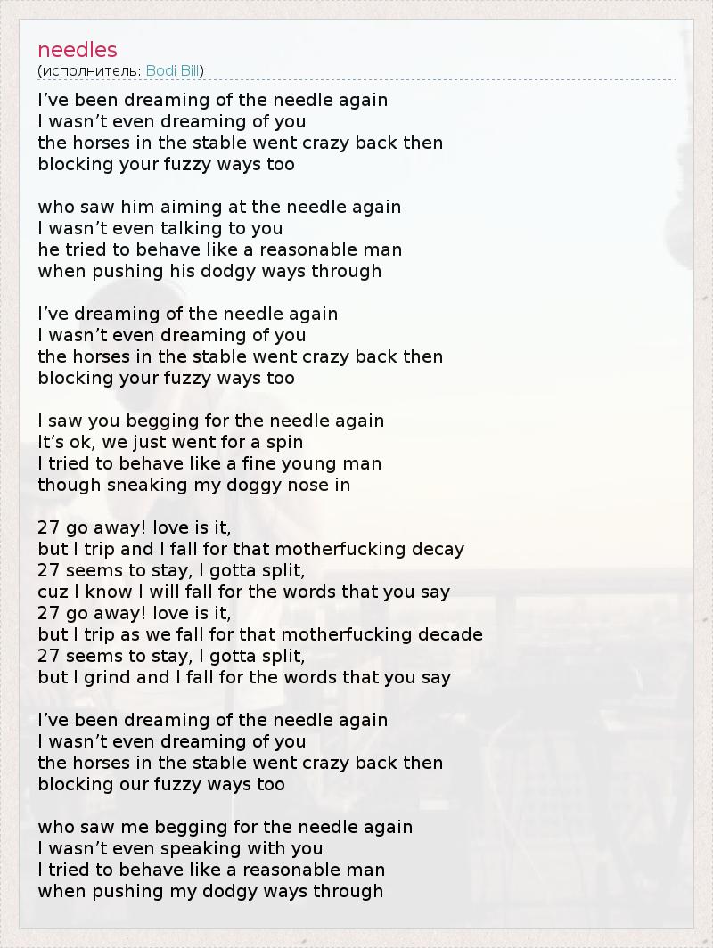 Я мечтал иглы снова Я даже не мечтал о вас лошади в конюшне сходили с ума, тогда блокируя свои нечеткие пути слишком кто видел его снова, направленный на иглу Я даже не говорю с вами он старался вести себя как разумный человек при нажатии его хитроумный пути через Я мечтал о иглы снова Я даже не мечтал о вас лошади в конюшне сходили с ума, тогда блокируя свои нечеткие пути слишком Я видел, как ты просил для иглы снова Это нормально, мы просто пошли на спину Я старался вести себя как прекрасный молодой человек хотя тайком мой собачий нос 27 уходи! любовь это, но я споткнуться и упасть я на этой ублюдок распада 27, кажется, остается, я должен разделить, Потому я знаю, что будет падать на слова, которые вы говорите 27 уходи! любовь это, но я отключиться мы попались на этом ублюдок десятилетия 27, кажется, остается, я должен разделить, но я измельчить и я падаю на слова, которые вы говорите Я мечтал иглы снова Я даже не мечтал о вас лошади в конюшне сходили с ума, тогда блокируя наши нечеткие пути слишком кто видел меня просят иглы снова Я даже не говоря с вами Я старался вести себя как разумный человек при нажатии мои изворотливые пути через
