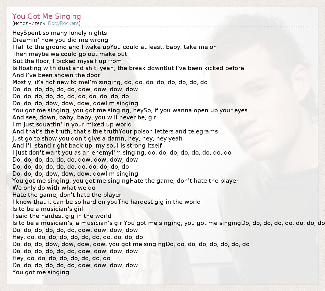 HeySpent so many lonely nights Dreamin' how you did me wrong I fall to the ground and I wake upYou could at least, baby, take me on Then maybe we could go out make out But the floor, I picked myself up from Is floating with dust and shit, yeah, the break downBut I've been kicked before And I've been shown the door Mostly, it's not new to meI'm singing, do, do, do, do, do, do, do, do Do, do, do, do, do, do, dow, dow, dow, dow Do, do, do, do, do, do, do, do, do, do, do Do, do, do, dow, dow, dow, dowI'm singing You got me singing, you got me singing, heySo, if you wanna open up your eyes And see, down, baby, baby, you will never be, girl I'm just squattin' in your mixed up world And that's the truth, that's the truthYour poison letters and telegrams Just go to show you don't give a damn, hey, hey, hey yeah And I'll stand right back up, my soul is strong itself I just don't want you as an enemyI'm singing, do, do, do, do, do, do, do, do Do, do, do, do, do, do, dow, dow, dow, dow Do, do, do, do, do, do, do, do, do, do, do Do, do, do, dow, dow, dow, dowI'm singing You got me singing, you got me singingHate the game, don't hate the player We only do with what we do Hate the game, don't hate the player I know that it can be so hard on youThe hardest gig in the world Is to be a musician's girl I said the hardest gig in the world Is to be a musician's, a musician's girlYou got me singing, you got me singingDo, do, do, do, do, do, do, do Do, do, do, do, do, do, dow, dow, dow, dow Hey, do, do, do, do, do, do, do, do, do, do, do Do, do, do, dow, dow, dow, dow, you got me singingDo, do, do, do, do, do, do, do Do, do, do, do, do, do, dow, dow, dow, dow Hey, do, do, do, do, do, do, do, do Do, do, do, do, do, do, dow, dow, dow, dow You got me singing