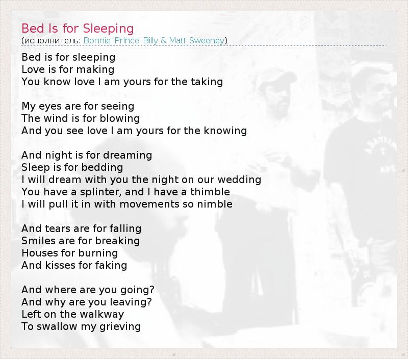 Bed is for sleeping Love is for making You know love I am yours for the taking My eyes are for seeing The wind is for blowing And you see love I am yours for the knowing And night is for dreaming Sleep is for bedding I will dream with you the night on our wedding You have a splinter, and I have a thimble I will pull it in with movements so nimble And tears are for falling Smiles are for breaking Houses for burning And kisses for faking And where are you going? And why are you leaving? Left on the walkway To swallow my grieving