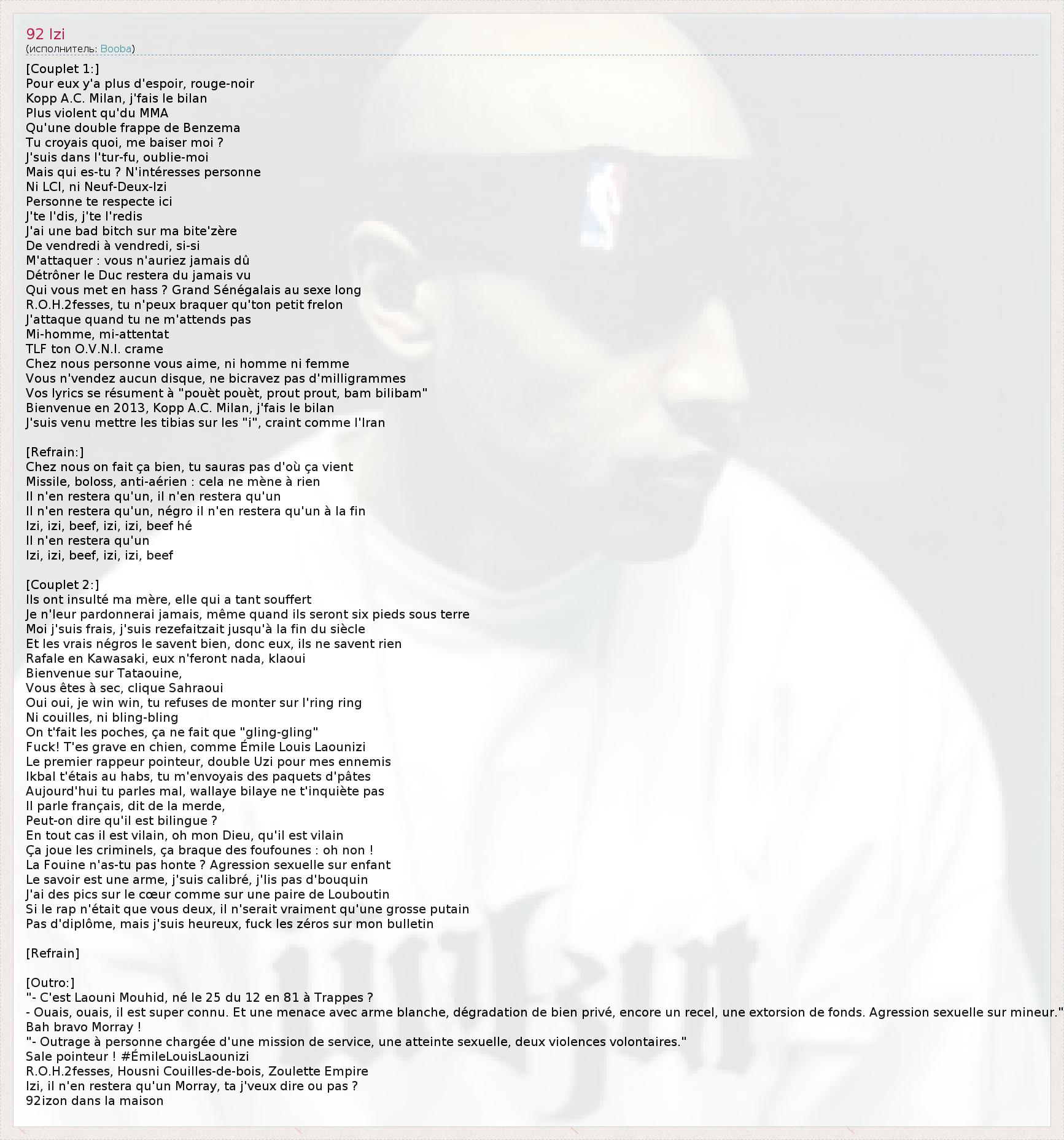 Это интересно:Booba, настоящее имя Élie Yaffa, также известный под сценическим псевдонимом Kopp, французский рэппер, родившийся 9 декабря 1976 г. в г. Boulogne-Billancourt. Основатель и член французской рэп-группы «92i», также объединяющей Hauts-de-Seine, Mala и Bram's (последний умер 21 мая 2011 г.). Также является основателем собственной марки уличной одежды «Ünkut» (*). За более чем 17-летнюю карьеру Booba является одним из самых известных... продолжение