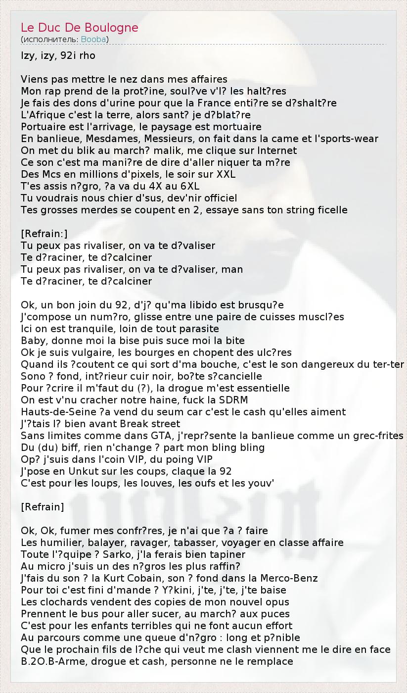 Это интересно:Booba, настоящее имя Élie Yaffa, также известный под сценическим псевдонимом Kopp, французский рэппер, родившийся 9 декабря 1976 г. в г. Boulogne-Billancourt. Основатель и член французской рэп-группы «92i», также объединяющей Hauts-de-Seine, Mala и Bram's (последний умер 21 мая 2011 г.). Также является основателем собственной марки уличной одежды «Ünkut» (*). За более чем 17-летнюю карьеру Booba является одним из самых известных... продолжение
