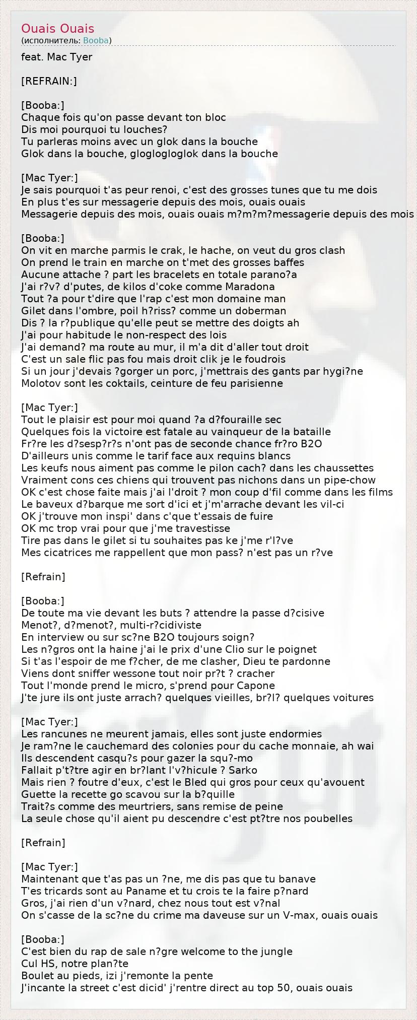 feat. Mac Tyer [REFRAIN:] [Booba:] Chaque fois qu'on passe devant ton bloc Dis moi pourquoi tu louches? Tu parleras moins avec un glok dans la bouche Glok dans la bouche, gloglogloglok dans la bouche [Mac Tyer:] Je sais pourquoi t'as peur renoi, c'est des grosses tunes que tu me dois En plus t'es sur messagerie depuis des mois, ouais ouais Messagerie depuis des mois, ouais ouais m?m?m?messagerie depuis des mois [Booba:] On vit en marche parmis le crak, le hache, on veut du gros clash On prend le train en marche on t'met des grosses baffes Aucune attache ? part les bracelets en totale parano?a J'ai r?v? d'putes, de kilos d'coke comme Maradona Tout ?a pour t'dire que l'rap c'est mon domaine man Gilet dans l'ombre, poil h?riss? comme un doberman Dis ? la r?publique qu'elle peut se mettre des doigts ah J'ai pour habitude le non-respect des lois J'ai demand? ma route au mur, il m'a dit d'aller tout droit C'est un sale flic pas fou mais droit clik je le foudrois Si un jour j'devais ?gorger un porc, j'mettrais des gants par hygi?ne Molotov sont les coktails, ceinture de feu parisienne [Mac Tyer:] Tout le plaisir est pour moi quand ?a d?fouraille sec Quelques fois la victoire est fatale au vainqueur de la bataille Fr?re les d?sesp?r?s n'ont pas de seconde chance fr?ro B2O D'ailleurs unis comme le tarif face aux requins blancs Les keufs nous aiment pas comme le pilon cach? dans les chaussettes Vraiment cons ces chiens qui trouvent pas nichons dans un pipe-chow OK c'est chose faite mais j'ai l'droit ? mon coup d'fil comme dans les films Le baveux d?barque me sort d'ici et j'm'arrache devant les vil-ci OK j'trouve mon inspi' dans c'que t'essais de fuire OK mc trop vrai pour que j'me travestisse Tire pas dans le gilet si tu souhaites pas ke j'me r'l?ve Mes cicatrices me rappellent que mon pass? n'est pas un r?ve [Refrain] [Booba:] De toute ma vie devant les buts ? attendre la passe d?cisive Menot?, d?menot?, multi-r?cidiviste En interview ou sur sc?ne B2O toujours soign? Les n?gros ont la haine j'ai le prix d'une Clio sur le poignet Si t'as l'espoir de me f?cher, de me clasher, Dieu te pardonne Viens dont sniffer wessone tout noir pr?t ? cracher Tout l'monde prend le micro, s'prend pour Capone J'te jure ils ont juste arrach? quelques vieilles, br?l? quelques voitures [Mac Tyer:] Les rancunes ne meurent jamais, elles sont juste endormies Je ram?ne le cauchemard des colonies pour du cache monnaie, ah wai Ils descendent casqu?s pour gazer la squ?-mo Fallait p't?tre agir en br?lant l'v?hicule ? Sarko Mais rien ? foutre d'eux, c'est le Bled qui gros pour ceux qu'avouent Guette la recette go scavou sur la b?quille Trait?s comme des meurtriers, sans remise de peine La seule chose qu'il aient pu descendre c'est pt?tre nos poubelles [Refrain] [Mac Tyer:] Maintenant que t'as pas un ?ne, me dis pas que tu banave T'es tricards sont au Paname et tu crois te la faire p?nard Gros, j'ai rien d'un v?nard, chez nous tout est v?nal On s'casse de la sc?ne du crime ma daveuse sur un V-max, ouais ouais [Booba:] C'est bien du rap de sale n?gre welcome to the jungle Cul HS, notre plan?te Boulet au pieds, izi j'remonte la pente J'incante la street c'est dicid' j'rentre direct au top 50, ouais ouais