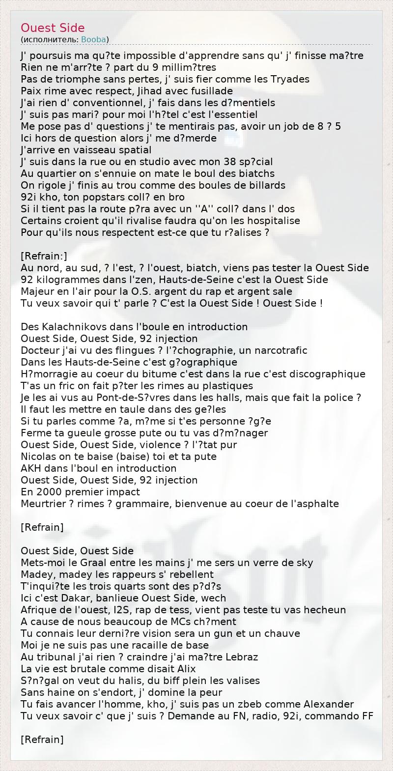 J' poursuis ma qu?te impossible d'apprendre sans qu' j' finisse ma?tre Rien ne m'arr?te ? part du 9 millim?tres Pas de triomphe sans pertes, j' suis fier comme les Tryades Paix rime avec respect, Jihad avec fusillade J'ai rien d' conventionnel, j' fais dans les d?mentiels J' suis pas mari? pour moi l'h?tel c'est l'essentiel Me pose pas d' questions j' te mentirais pas, avoir un job de 8 ? 5 Ici hors de question alors j' me d?merde J'arrive en vaisseau spatial J' suis dans la rue ou en studio avec mon 38 sp?cial Au quartier on s'ennuie on mate le boul des biatchs On rigole j' finis au trou comme des boules de billards 92i kho, ton popstars coll? en bro Si il tient pas la route p?ra avec un ''A'' coll? dans l' dos Certains croient qu'il rivalise faudra qu'on les hospitalise Pour qu'ils nous respectent est-ce que tu r?alises ? [Refrain:] Au nord, au sud, ? l'est, ? l'ouest, biatch, viens pas tester la Ouest Side 92 kilogrammes dans l'zen, Hauts-de-Seine c'est la Ouest Side Majeur en l'air pour la O.S. argent du rap et argent sale Tu veux savoir qui t' parle ? C'est la Ouest Side ! Ouest Side ! Des Kalachnikovs dans l'boule en introduction Ouest Side, Ouest Side, 92 injection Docteur j'ai vu des flingues ? l'?chographie, un narcotrafic Dans les Hauts-de-Seine c'est g?ographique H?morragie au coeur du bitume c'est dans la rue c'est discographique T'as un fric on fait p?ter les rimes au plastiques Je les ai vus au Pont-de-S?vres dans les halls, mais que fait la police ? Il faut les mettre en taule dans des ge?les Si tu parles comme ?a, m?me si t'es personne ?g?e Ferme ta gueule grosse pute ou tu vas d?m?nager Ouest Side, Ouest Side, violence ? l'?tat pur Nicolas on te baise (baise) toi et ta pute AKH dans l'boul en introduction Ouest Side, Ouest Side, 92 injection En 2000 premier impact Meurtrier ? rimes ? grammaire, bienvenue au coeur de l'asphalte [Refrain] Ouest Side, Ouest Side Mets-moi le Graal entre les mains j' me sers un verre de sky Madey, madey les rappeurs s' rebellent T'inqui?te les trois quarts sont des p?d?s Ici c'est Dakar, banlieue Ouest Side, wech Afrique de l'ouest, I2S, rap de tess, vient pas teste tu vas hecheun A cause de nous beaucoup de MCs ch?ment Tu connais leur derni?re vision sera un gun et un chauve Moi je ne suis pas une racaille de base Au tribunal j'ai rien ? craindre j'ai ma?tre Lebraz La vie est brutale comme disait Alix S?n?gal on veut du halis, du biff plein les valises Sans haine on s'endort, j' domine la peur Tu fais avancer l'homme, kho, j' suis pas un zbeb comme Alexander Tu veux savoir c' que j' suis ? Demande au FN, radio, 92i, commando FF [Refrain]
