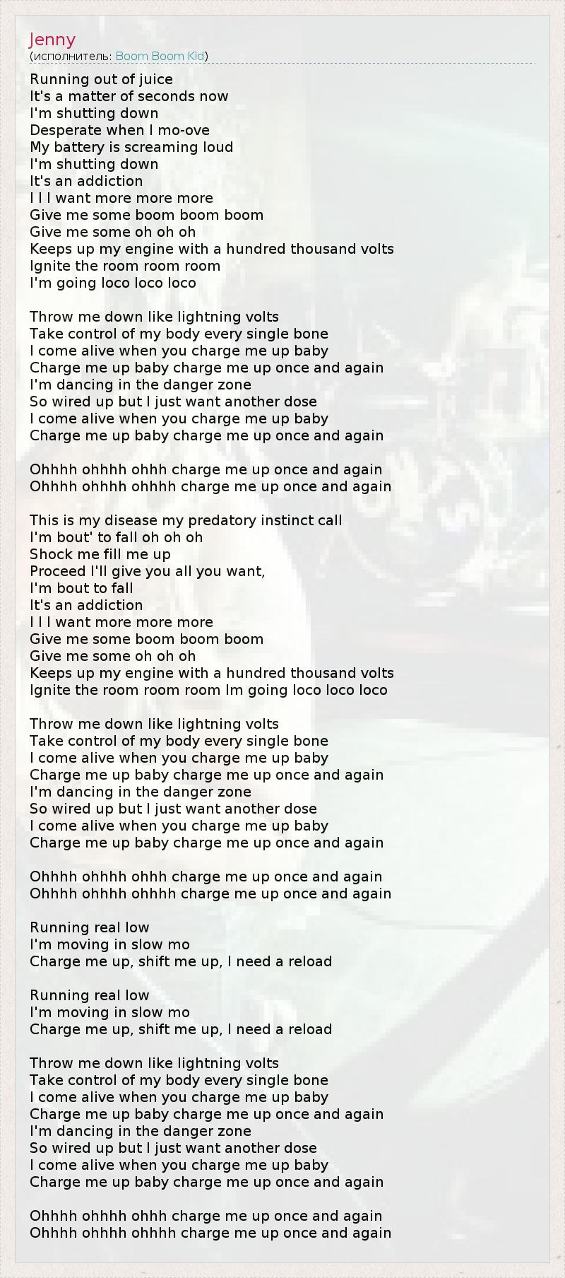 Горючее заканчивается, Осталась пара секунд, Я отключаюсь, Отчаянно двигаюсь, Заряд батареи на исходе, Я отключаюсь, Это зависимость, Мне нужно все больше и больше, Дай мне немного бум-бум-бум, Дай мне немного о-о-о, Это заряжает мой двигатель на сотню тысяч вольт, Воспламеняю помещение, Я становлюсь сумасшедшей. Обрушь на меня заряд электричества, Овладей моим телом, каждой его частичкой, Я оживаю, когда ты подзаряжаешь меня, малыш, Заряди меня, малыш! Заряди меня еще и еще! Я танцую в опасной зоне, Заряженная, но мне снова нужна доза, Я оживаю, когда ты ты подзаряжаешь меня, малыш, Заряди меня, малыш! Заряди меня еще и еще! О, заряди меня еще и еще! О, заряди меня еще и еще! Это моя болезнь, мой позыв хищного инстинкта, Силы на исходе, о Шокируй меня, заряди меня, Продолжай и я отдам все, что пожелаешь, Силы на исходе, Это зависимость, Мне нужно все больше и больше, Дай мне немного бум-бум-бум, Дай мне немного о-о-о, Это заряжает мой двигатель на сотню тысяч вольт, Воспламеняю помещение, я становлюсь сумасшедшей. Обрушь на меня заряд электричества, Овладей моим телом, каждой его частичкой, Я оживаю, когда ты подзаряжаешь меня, малыш, Заряди меня, малыш! Заряди меня еще и еще! Я танцую в опасной зоне, Заряженная, но мне снова нужна доза, Я оживаю, когда ты ты подзаряжаешь меня, малыш, Заряди меня, малыш! Заряди меня еще и еще! О, заряди меня еще и еще! О, заряди меня еще и еще! Мои силы почти иссякли, Я замедляюсь, Заряди меня, переключи меня, мне нужна перезагрузка. Мои силы почти иссякли, Я замедляюсь, Заряди меня, переключи меня, мне нужна перезагрузка. Обрушь на меня заряд электричества, Овладей моим телом, каждой его частичкой, Я оживаю, когда ты подзаряжаешь меня, малыш, Заряди меня, малыш! Заряди меня еще и еще! Я танцую в опасной зоне, Заряженная, но мне снова нужна доза, Я оживаю, когда ты ты подзаряжаешь меня, малыш, Заряди меня, малыш! Заряди меня еще и еще! О, заряди меня еще и еще! О, заряди меня еще и еще!