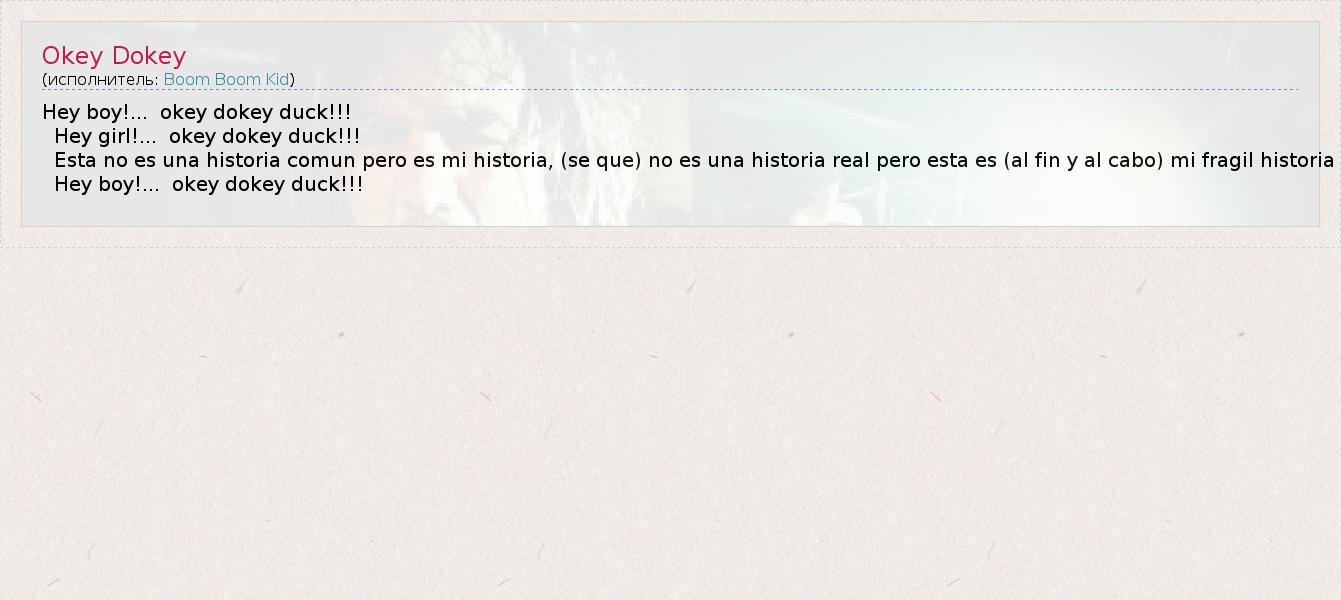 Hey boy!... okey dokey duck!!! Hey girl!... okey dokey duck!!! Esta no es una historia comun pero es mi historia, (se que) no es una historia real pero esta es (al fin y al cabo) mi fragil historia Hey boy!... okey dokey duck!!!