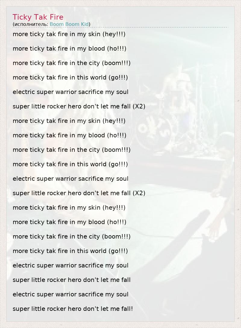 more ticky tak fire in my skin (hey!!!) more ticky tak fire in my blood (ho!!!) more ticky tak fire in the city (boom!!!) more ticky tak fire in this world (go!!!) electric super warrior sacrifice my soul super little rocker hero don't let me fall (X2) more ticky tak fire in my skin (hey!!!) more ticky tak fire in my blood (ho!!!) more ticky tak fire in the city (boom!!!) more ticky tak fire in this world (go!!!) electric super warrior sacrifice my soul super little rocker hero don't let me fall (X2) more ticky tak fire in my skin (hey!!!) more ticky tak fire in my blood (ho!!!) more ticky tak fire in the city (boom!!!) more ticky tak fire in this world (go!!!) electric super warrior sacrifice my soul super little rocker hero don't let me fall electric super warrior sacrifice my soul super little rocker hero don't let me fall!