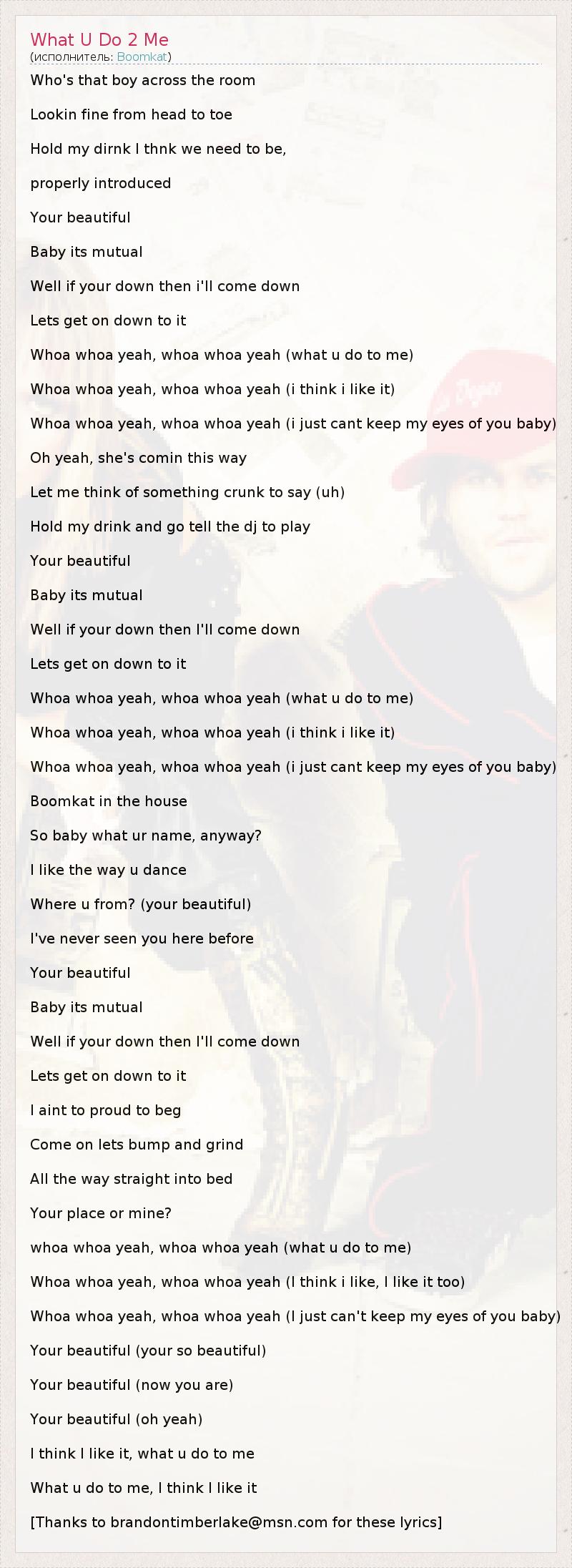 Who's that boy across the room Lookin fine from head to toe Hold my dirnk I thnk we need to be, properly introduced Your beautiful Baby its mutual Well if your down then i'll come down Lets get on down to it Whoa whoa yeah, whoa whoa yeah (what u do to me) Whoa whoa yeah, whoa whoa yeah (i think i like it) Whoa whoa yeah, whoa whoa yeah (i just cant keep my eyes of you baby) Oh yeah, she's comin this way Let me think of something crunk to say (uh) Hold my drink and go tell the dj to play Your beautiful Baby its mutual Well if your down then I'll come down Lets get on down to it Whoa whoa yeah, whoa whoa yeah (what u do to me) Whoa whoa yeah, whoa whoa yeah (i think i like it) Whoa whoa yeah, whoa whoa yeah (i just cant keep my eyes of you baby) Boomkat in the house So baby what ur name, anyway? I like the way u dance Where u from? (your beautiful) I've never seen you here before Your beautiful Baby its mutual Well if your down then I'll come down Lets get on down to it I aint to proud to beg Come on lets bump and grind All the way straight into bed Your place or mine? whoa whoa yeah, whoa whoa yeah (what u do to me) Whoa whoa yeah, whoa whoa yeah (I think i like, I like it too) Whoa whoa yeah, whoa whoa yeah (I just can't keep my eyes of you baby) Your beautiful (your so beautiful) Your beautiful (now you are) Your beautiful (oh yeah) I think I like it, what u do to me What u do to me, I think I like it [Thanks to brandontimberlake@msn.com for these lyrics]